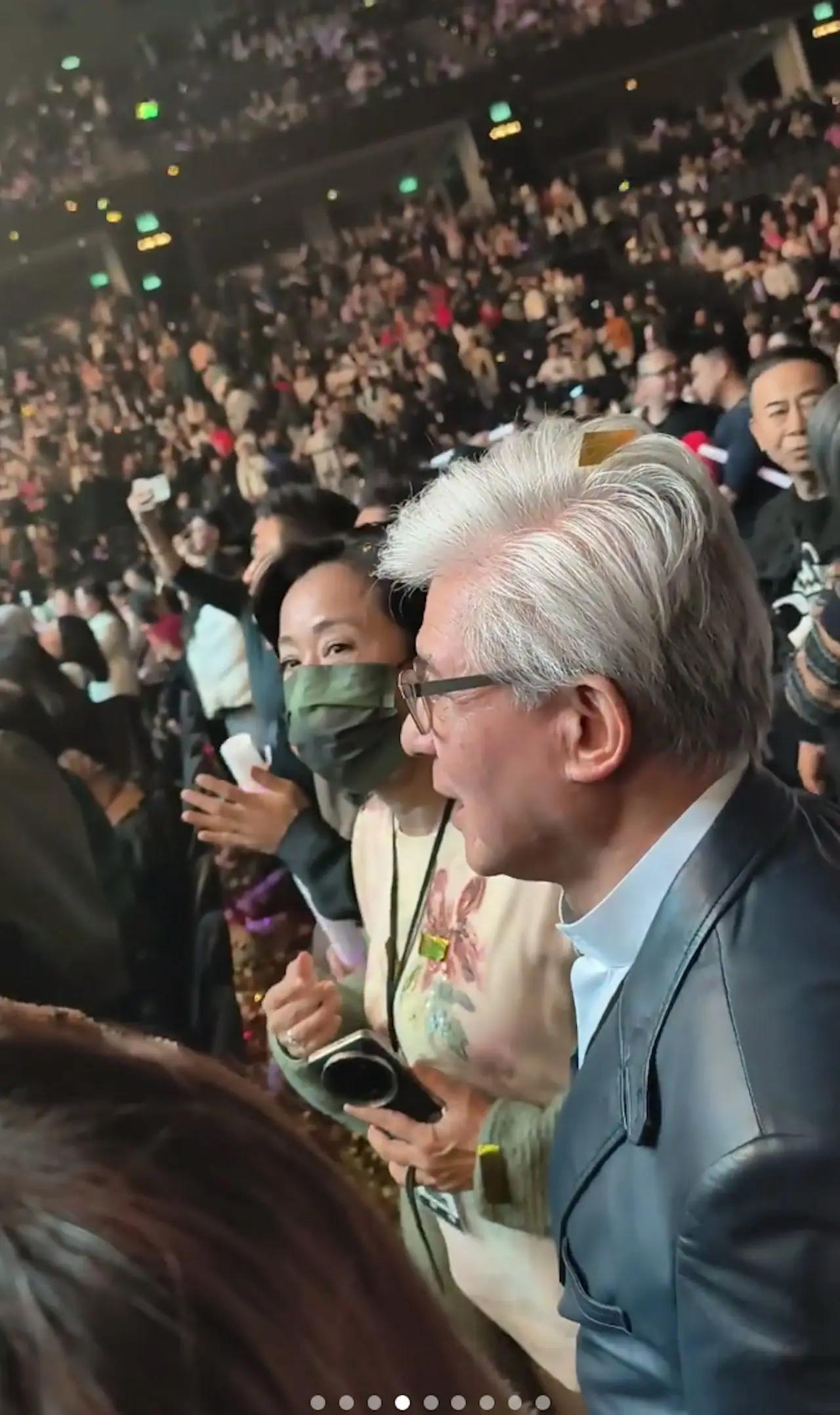 這次葉倩文和林子祥開演唱會,朱玲玲帶着丈夫羅康瑞捧場。他們就坐在觀衆席上,朱玲玲穿了一件米色上衣,點綴粉色刺繡,顯得她很年輕。