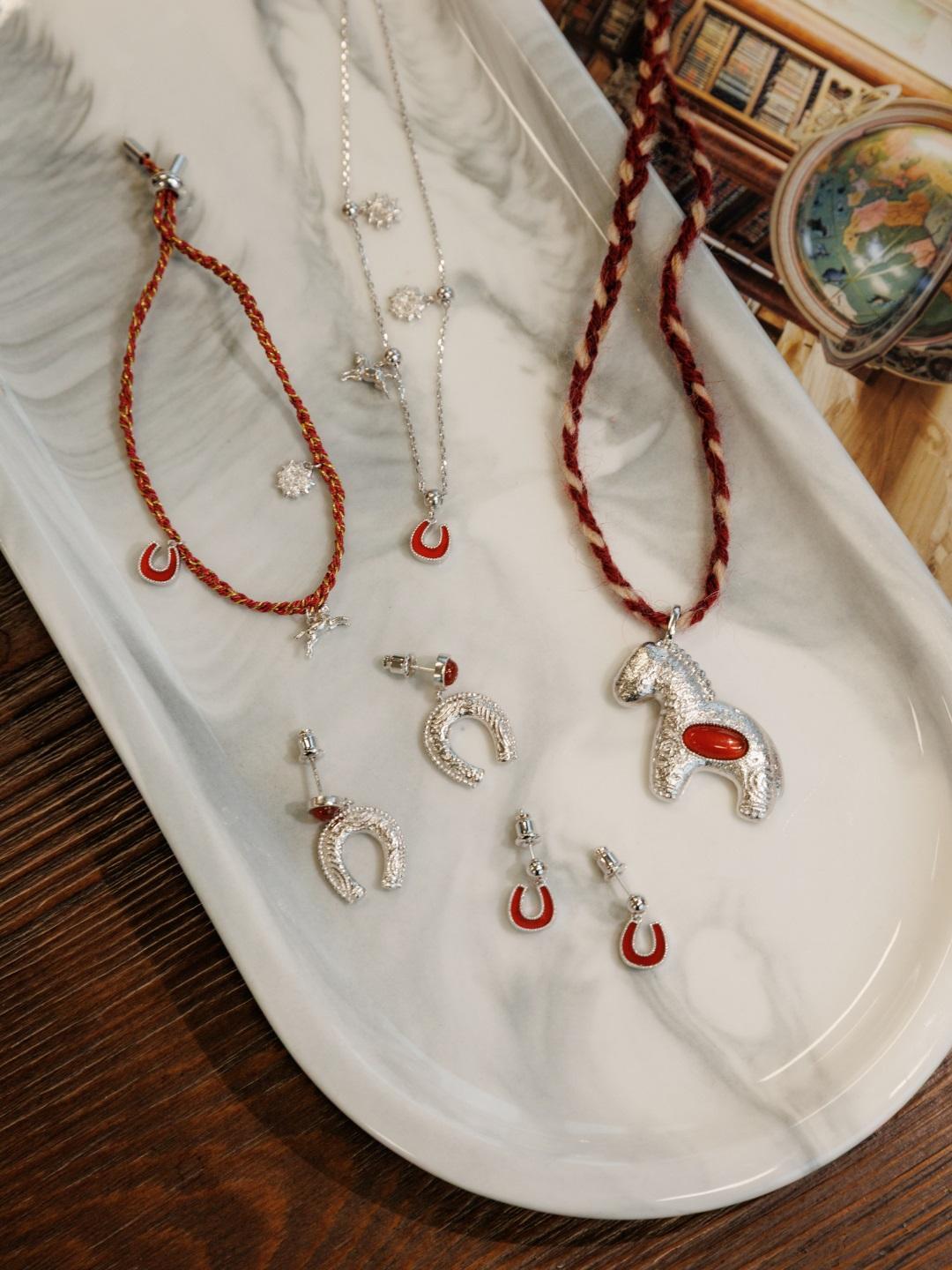 小馬、紅瑪瑙馬蹄、太陽三枚精緻吊墜串在一起,象徵着“把一馬當先、奔赴山海的勇氣和美好”都戴在手上,給自己默默打氣。▼
