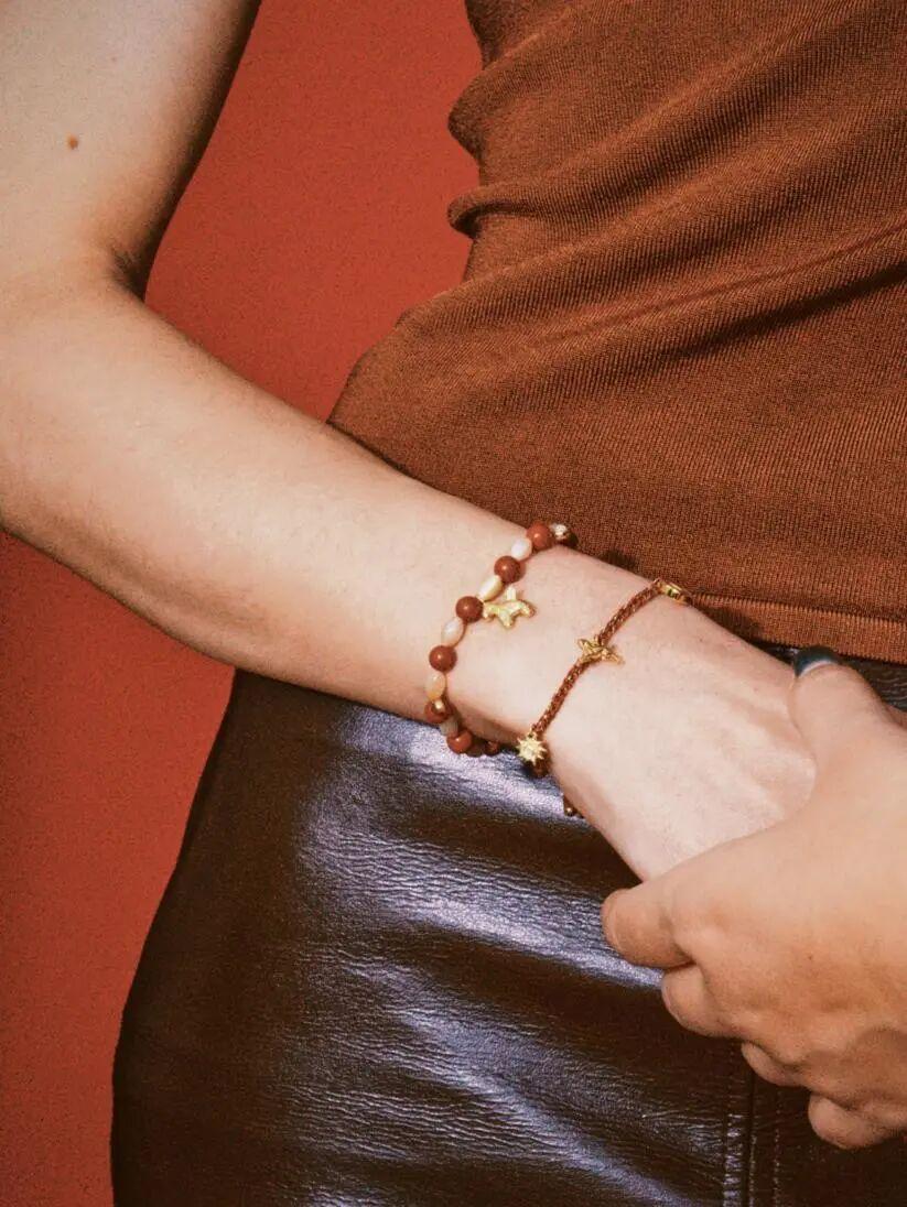 比如和這條編織手鍊搭在一起,同樣是紅金配色,上手很顯貴、顯白~▼