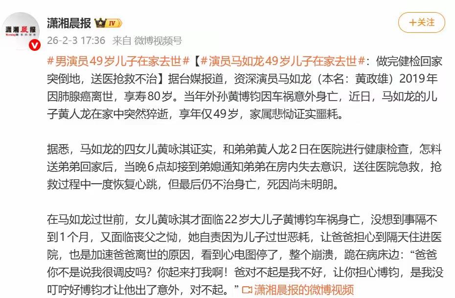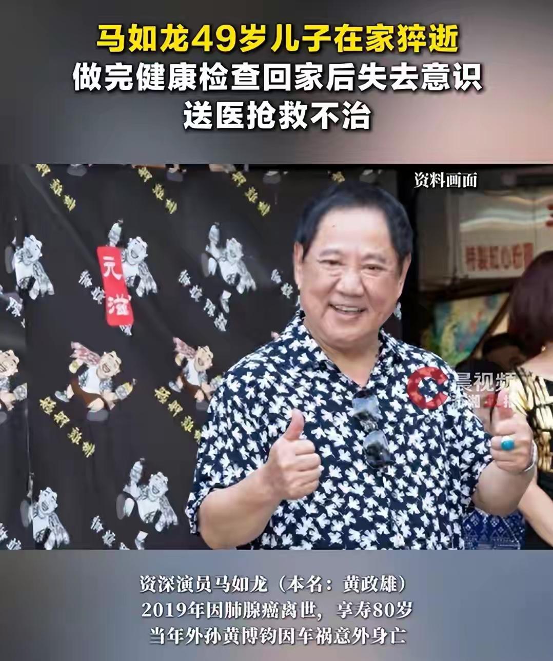太離奇了!2月3日,演員馬如龍的兒子黃人龍被曝在家中去世。