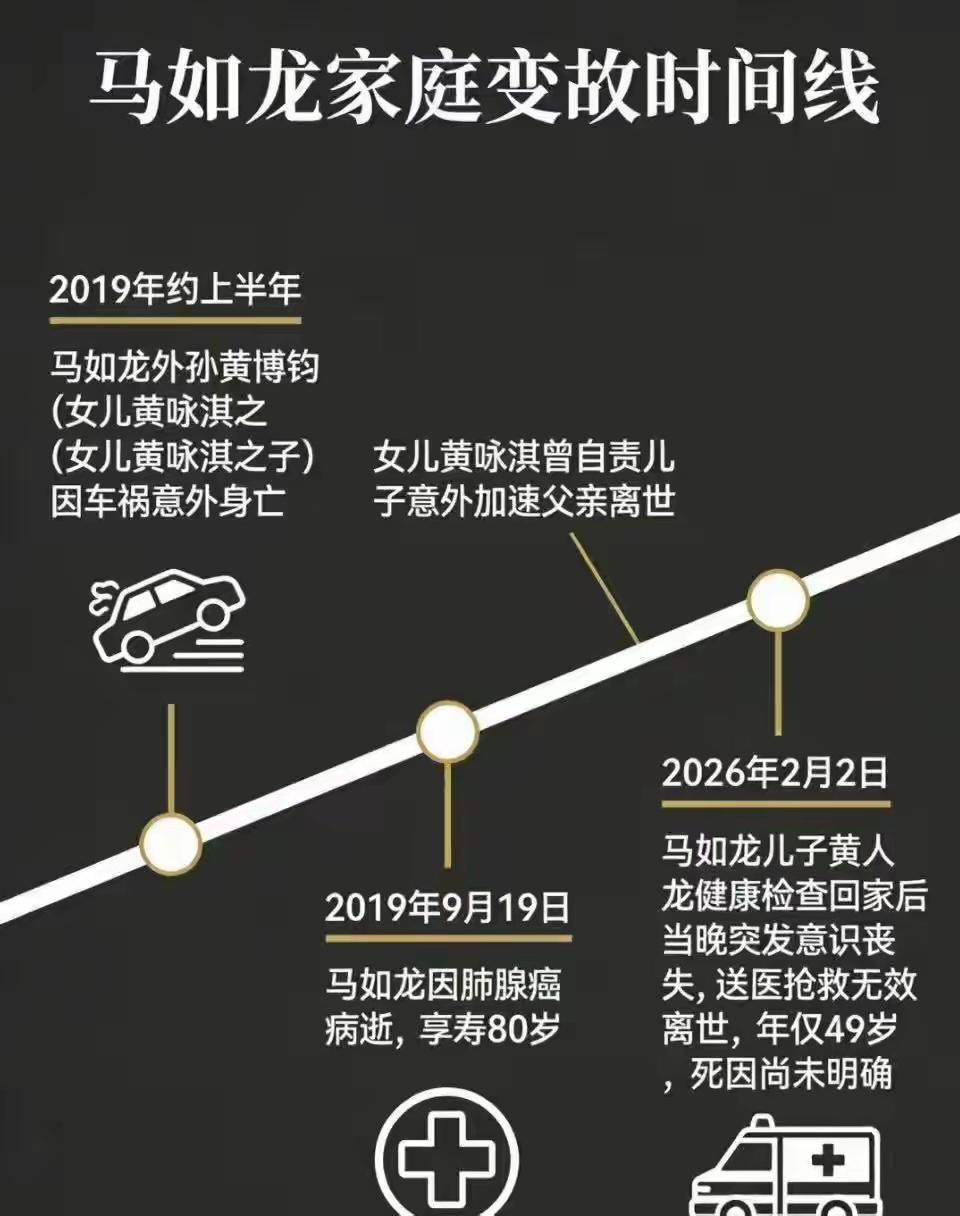 如果站在馬如龍四女兒黃泳淇的角度來看,7年前22歲大兒子黃博鈞車禍身亡,不時隔不到一個月父親就撒手人寰,7年後自己的弟弟黃人龍又在家中去世。