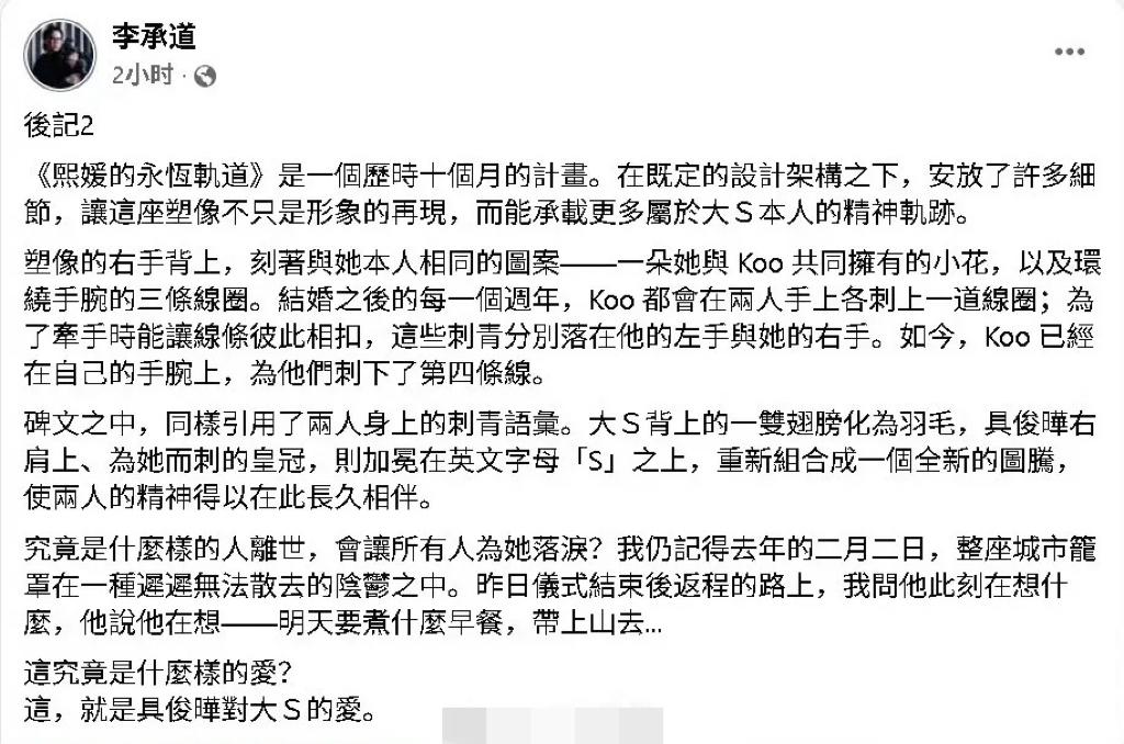 雖然大S的雕像和她不是很像,但其中有很多讓人感動的細節。比如雕像手腕附近的小花紋身、就是她和具俊曄的同款紋身。