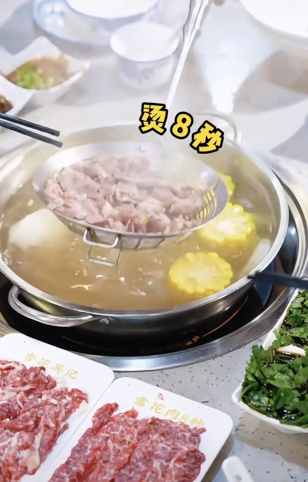 牛肉片下鍋,只需要煮8秒鐘就可以撈出來品嚐美味了。甘比要的是一個清湯鍋,清湯鍋最大的特點就是可以保持食物本身的那種鮮美。