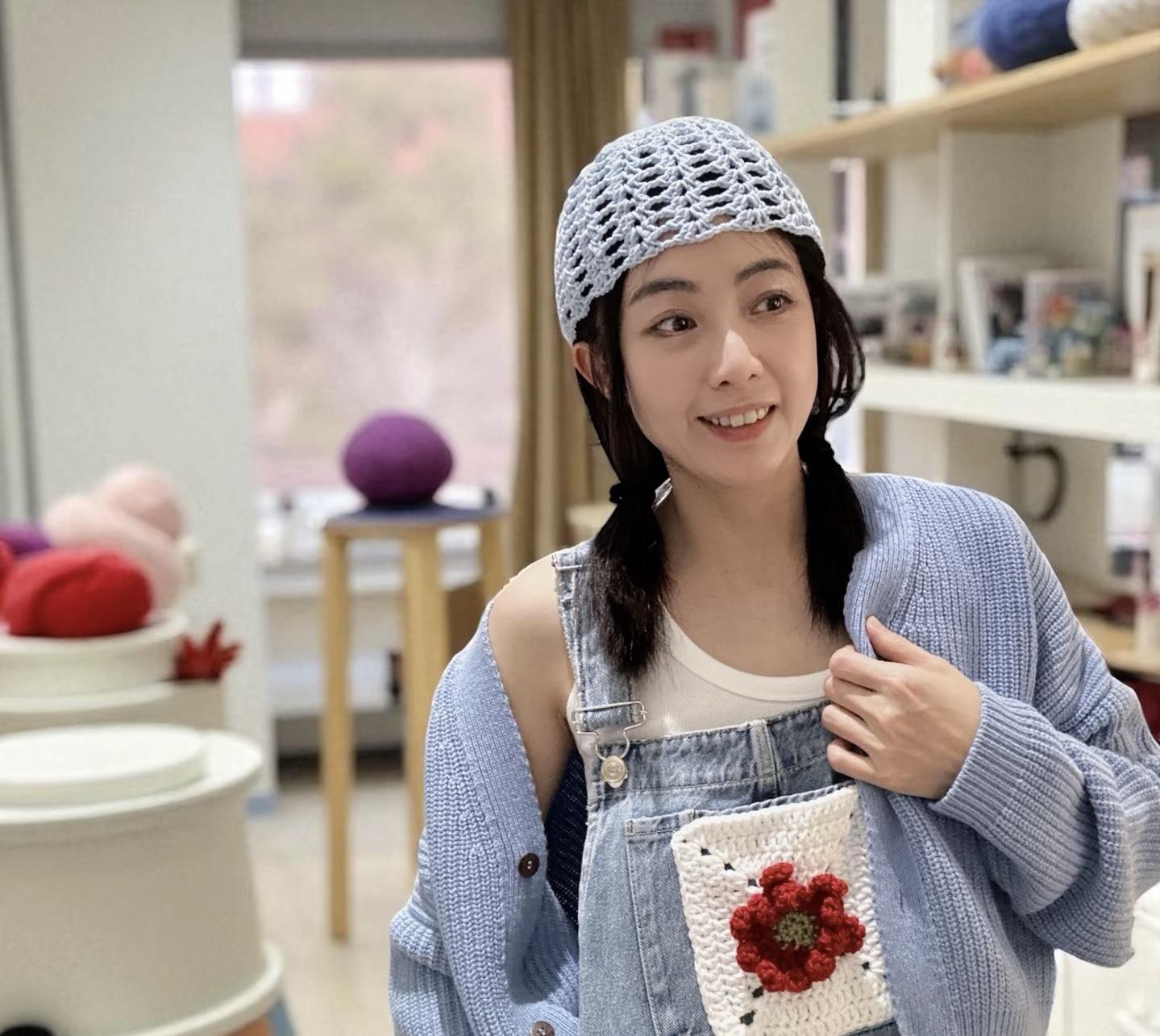 日常裏甘比更喜歡簡約休閒的穿搭,揹帶褲、針織開衫、配一頂自己鉤織的帽子,還扎着雙馬尾辮,這個模樣真是清純甜美又減齡。