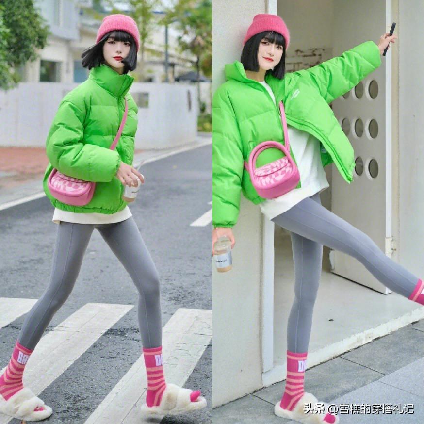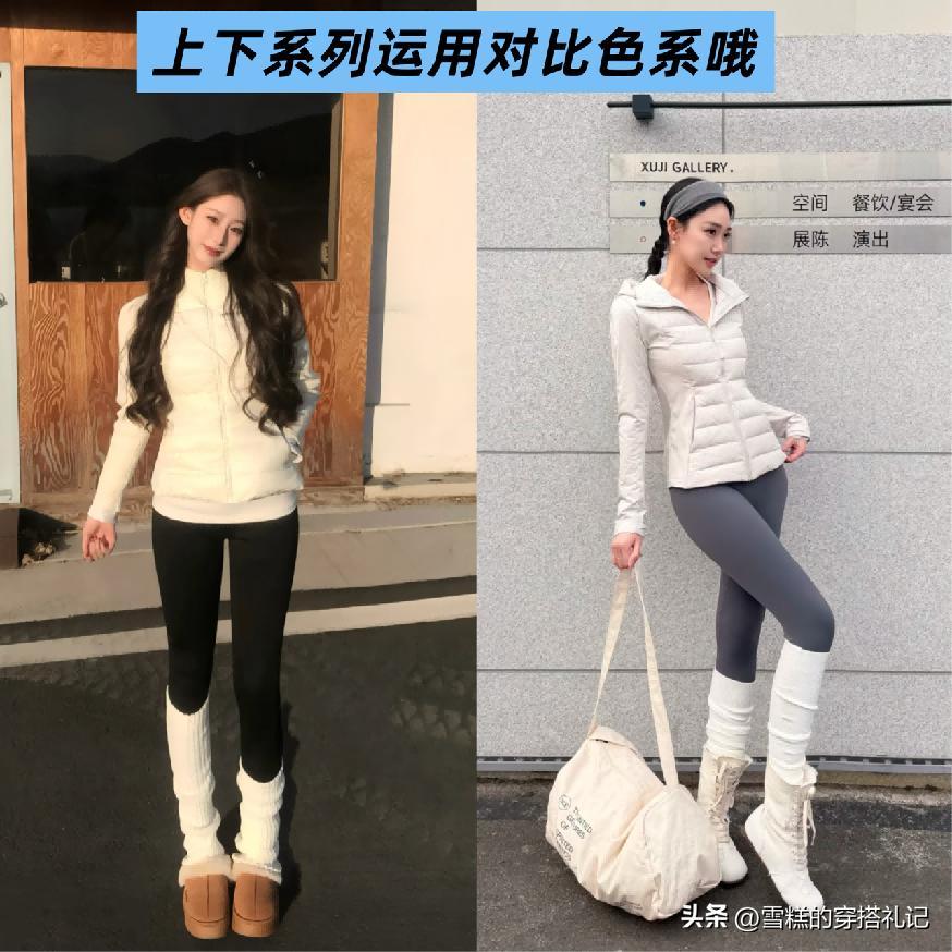 而且從視覺上來強調的話,其實對比的色調也是比較關鍵的,上半身的羽絨服又或者是你所選擇的內搭就可以是淺色,亦可是彩色調的存在,在視覺上是能夠與下半部分暗色系的lulu瑜伽褲進行對比的。