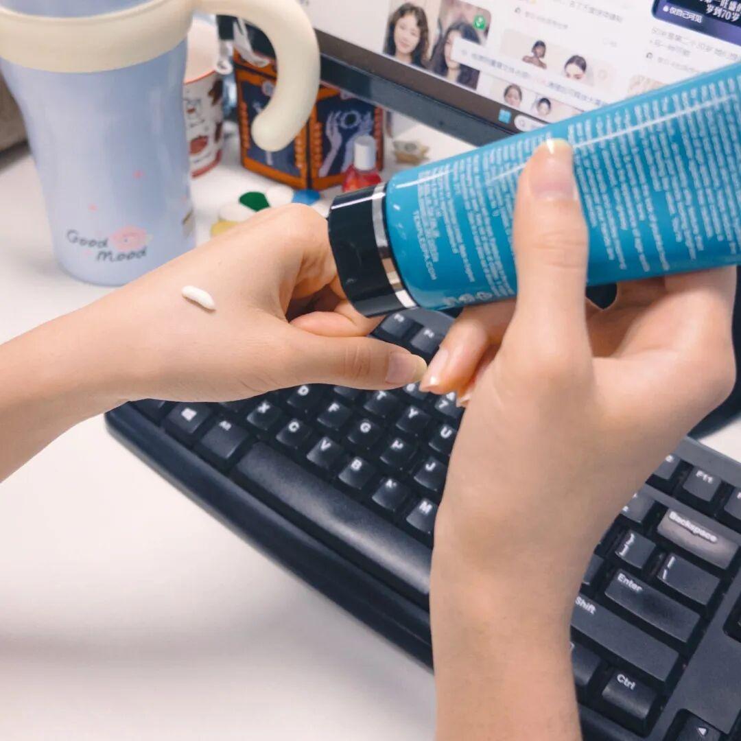 每次擠2-3顆黃豆大小就夠,對打工人特別友好,塗完接着碼字、看手機也完全不影響。▼