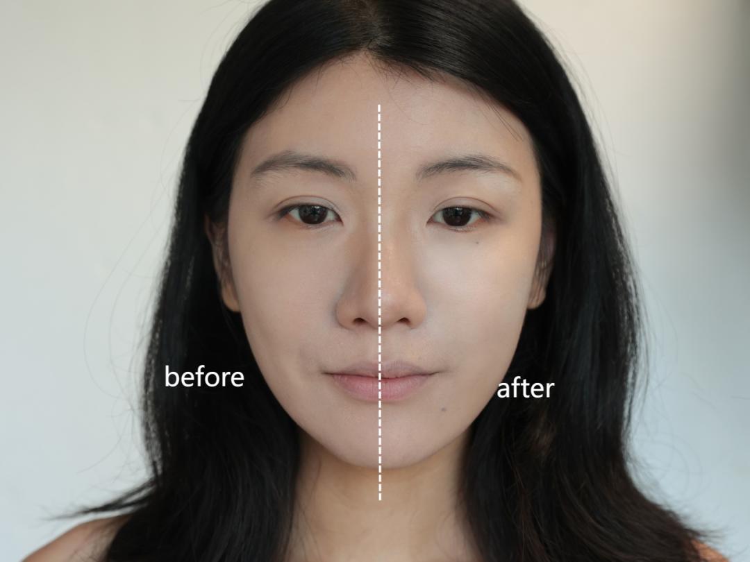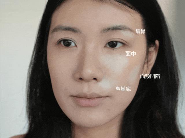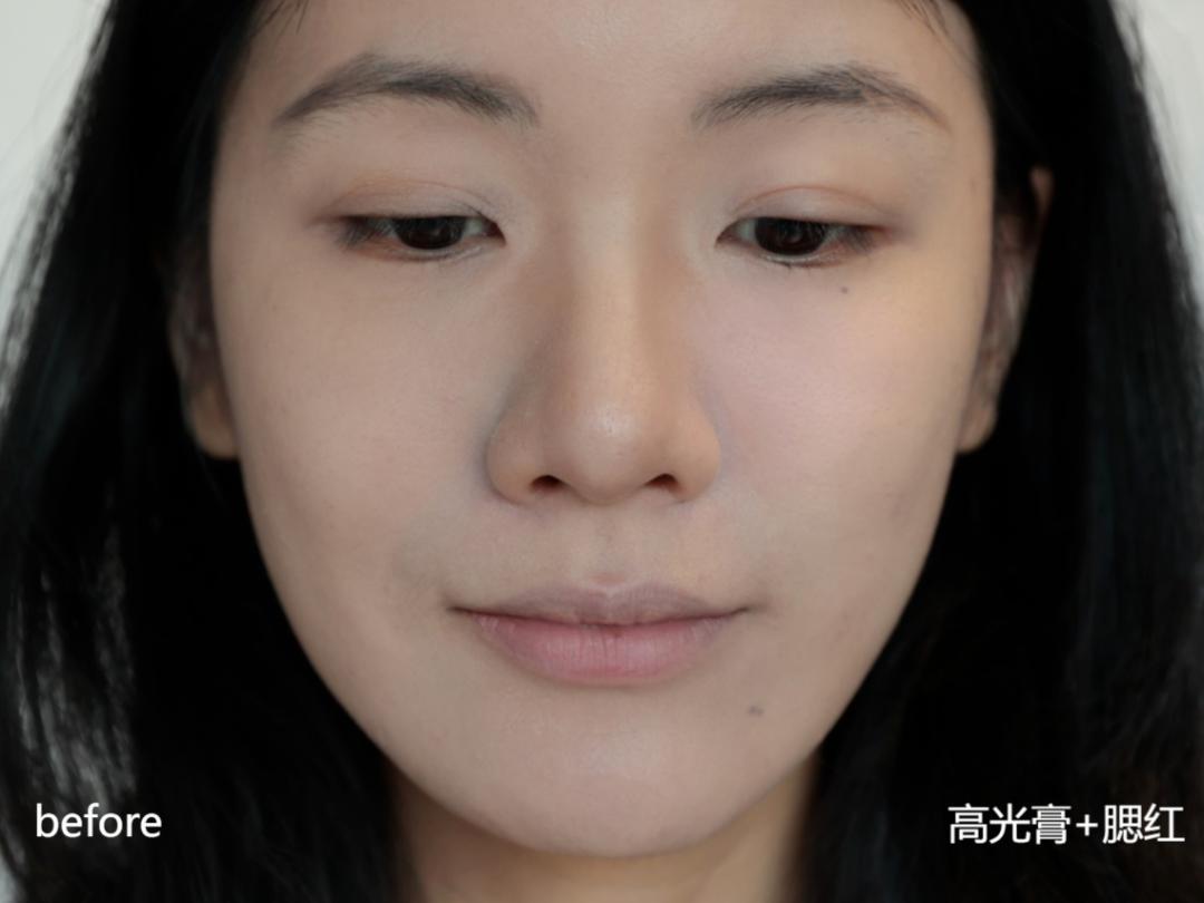 我們工作室黃黑皮的美妝達人Sisi,專門用左右臉對比了一下,用完腮紅+高光的那一側,面中很明顯嘭起來了。▼