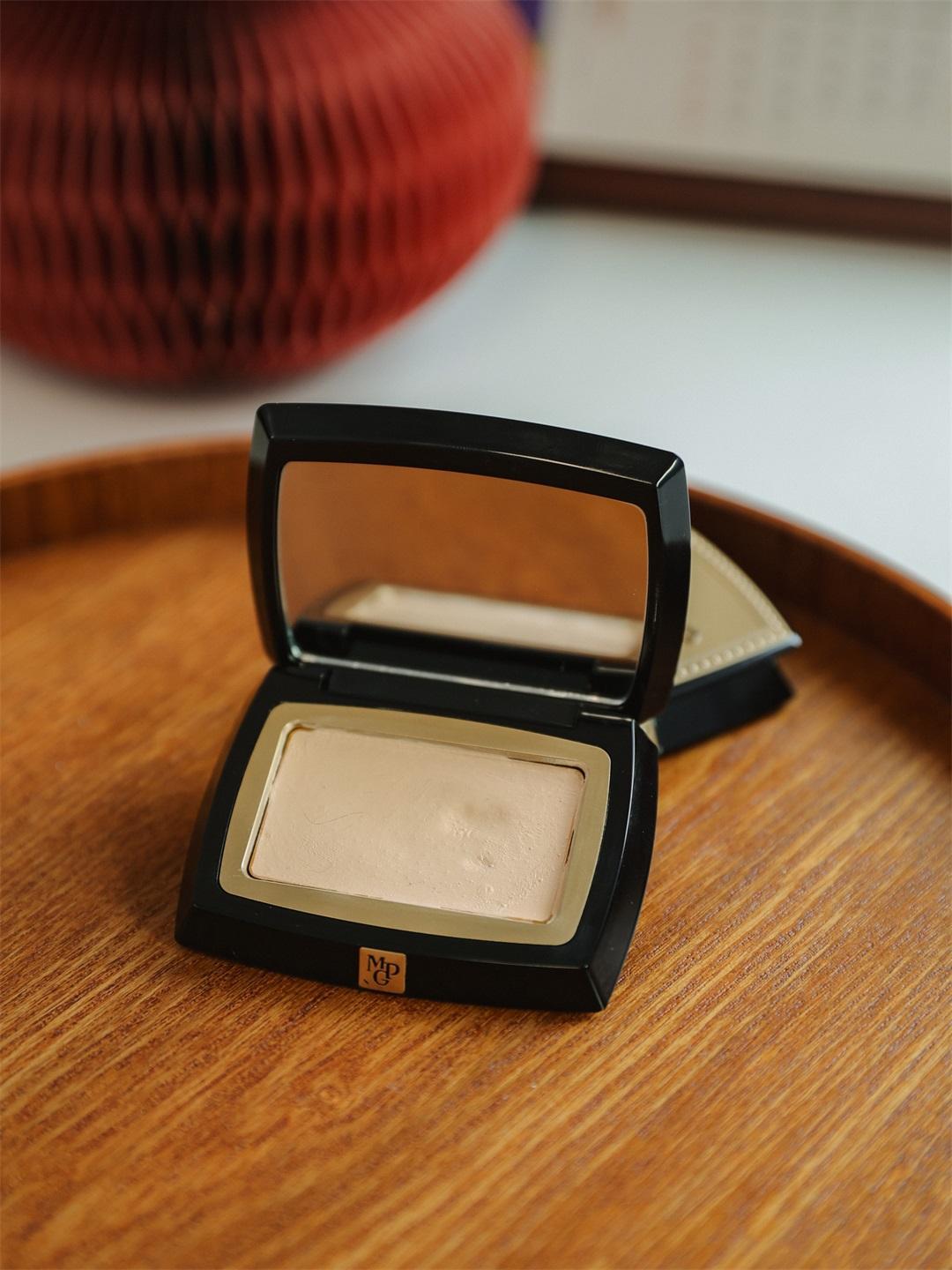 平時用它定妝,粉質細膩,啞光妝效清透得像柔焦過,帶一點點很細的珠光,不假白。▼