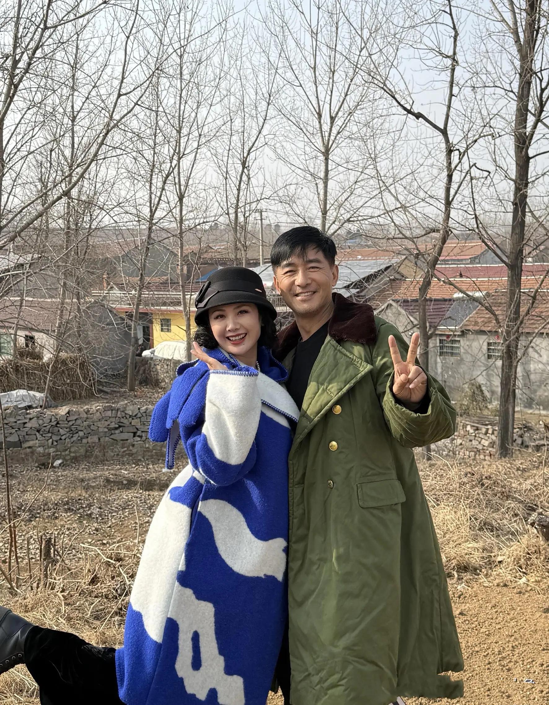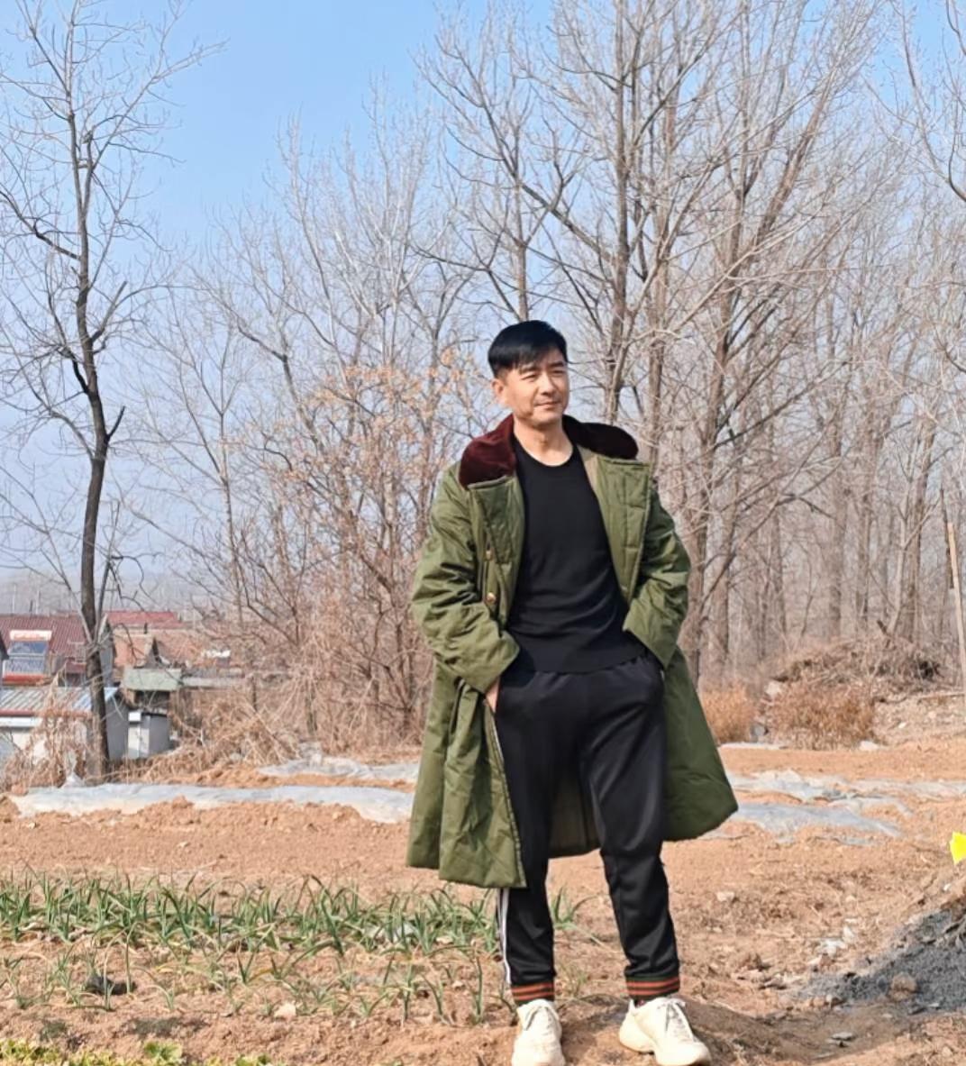 雖然是大明星,但是回到老家就非常接地氣。郭曉東穿了一件軍大衣站在村頭拍照,他皮膚黝黑、身材挺拔。