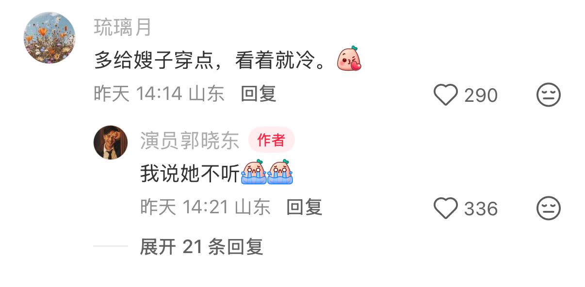 拍《北國風》》的時候,兩人有3天對手戲。當時程莉莎是小有名氣的話劇演員,郭曉冬剛畢業不久。程莉莎認爲郭曉東“太佛系”,郭曉東認爲程莉莎“嬌氣多事”。