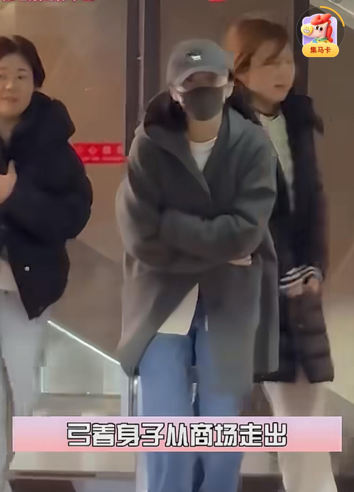 景甜陪媽媽逛商場,雙手叉腰捂着肚子走出來,表情痛苦不像凍得