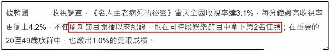 《名人生老病死的祕密》當天全國收視率達3.1%,不斷刷新節目在同時段娛樂節目中的成績,拿下第二名。