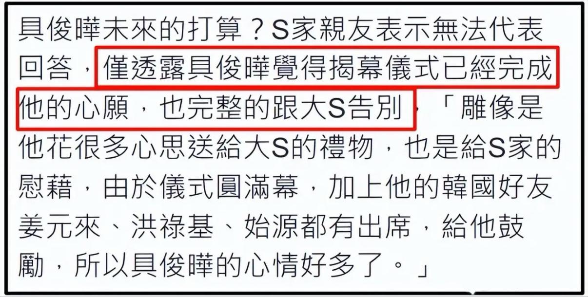 而關於具俊曄未來打算,S家親友表示無法回答,勁透露具俊曄覺得揭幕儀式已經完成他的心願,也完整跟大S告別了,將回韓國和媽媽姊姊一起過年。