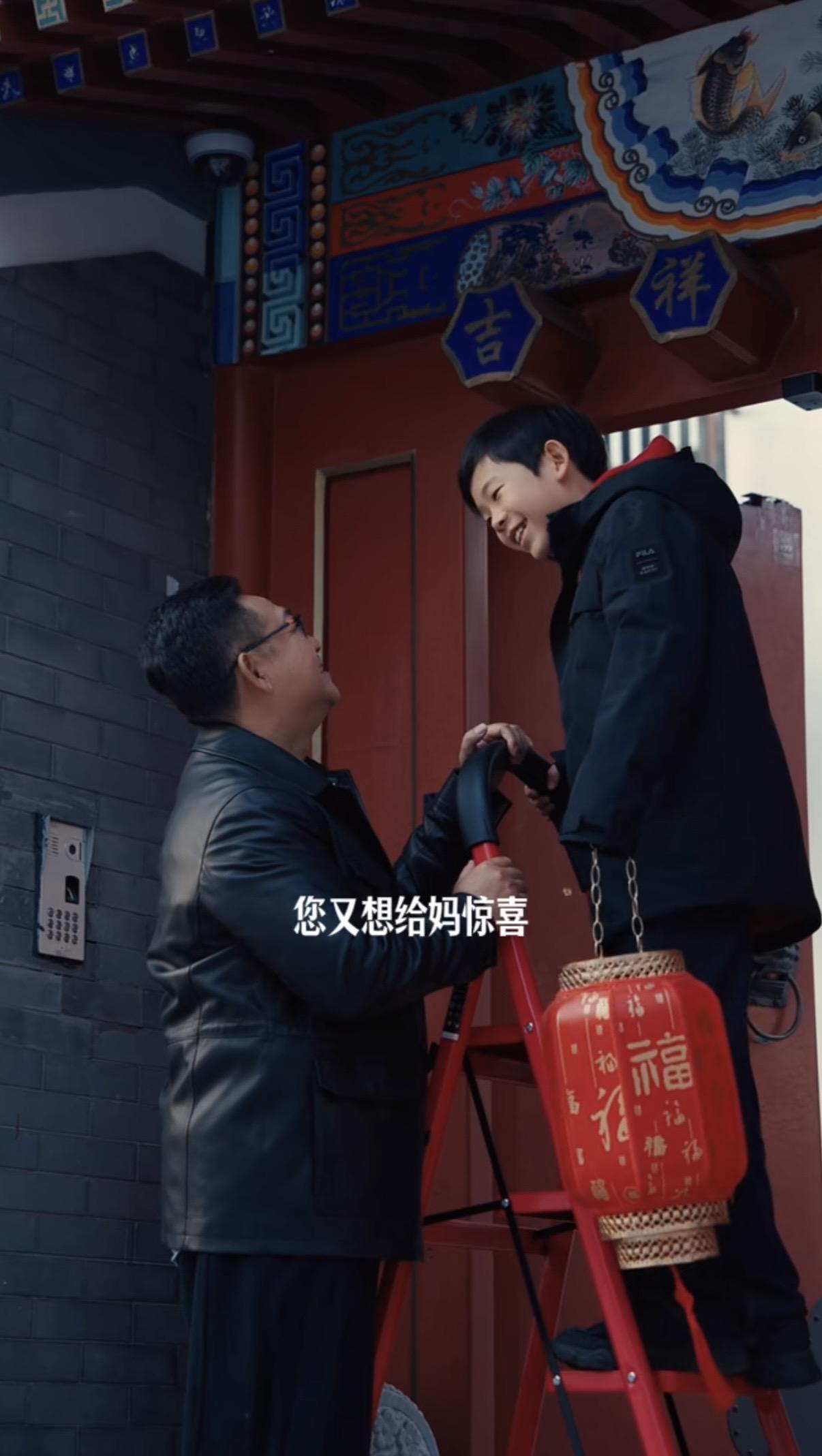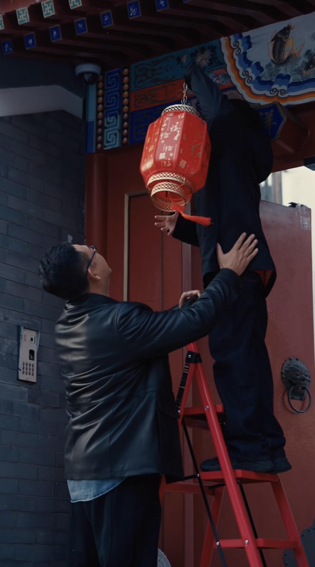 姜武和兒子一起掛燈籠,他們搬來一個紅色的摺疊梯,兒子踩着梯子上去掛燈籠。姜武提醒兒子小心一些,兒子很放心說“爸,有您在呢”。