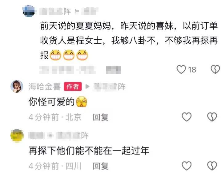 還有蹲李亞鵬直播間的網友,說前天李亞鵬稱呼金喜夏夏媽媽、昨天說的是喜妹、以前訂單的收貨人是程女士。這些細節也說明,李亞鵬和海哈金喜的感情正在升溫。