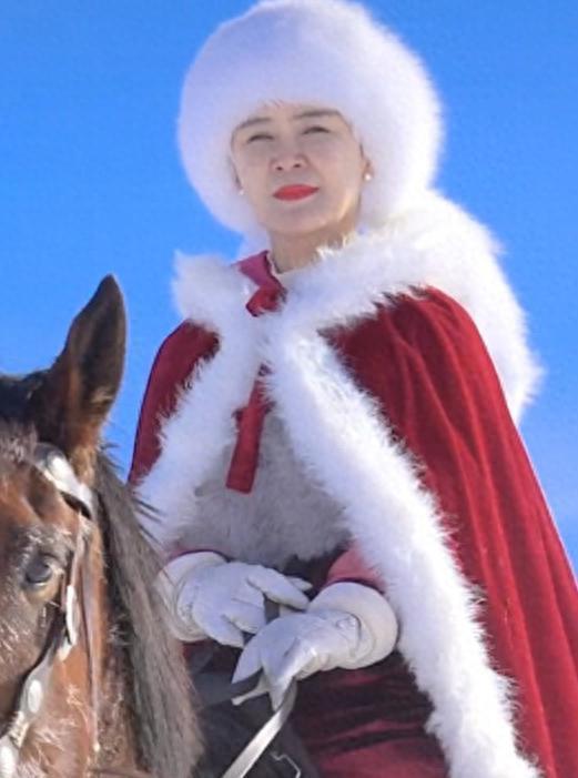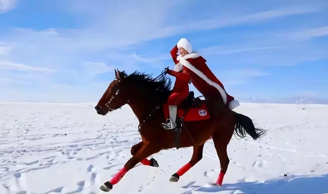 這次拍攝用的不是她自己的馬,賀嬌龍依舊選擇了她鍾愛的紅色系裝扮。深紅色馬甲搭配馬面裙,在雪地裏又颯又美。