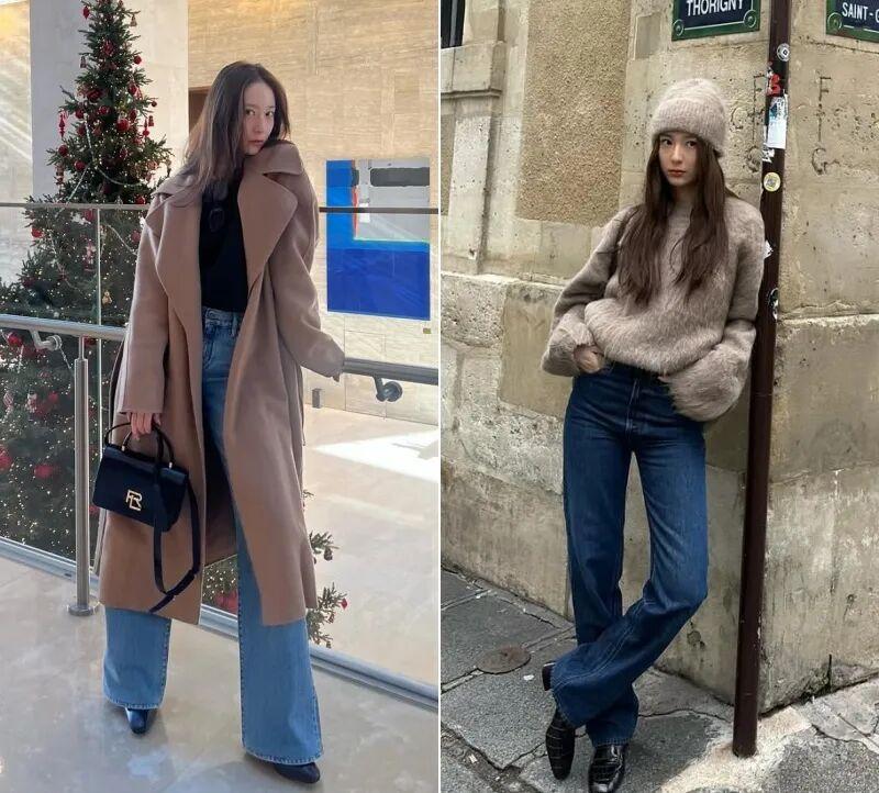 無論多麼臃腫寬大的外套,只要用這兩條牛仔褲勾勒出下半身的曲線,就會顯得輕盈。▼