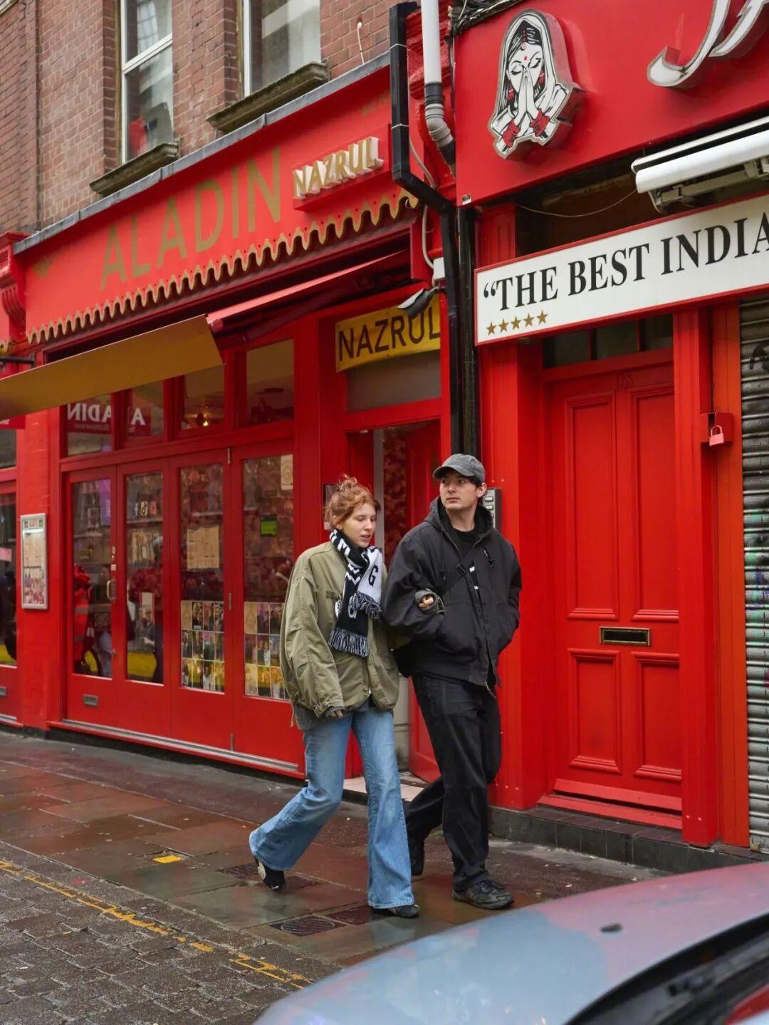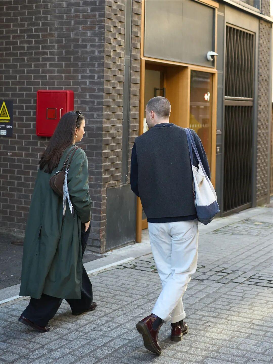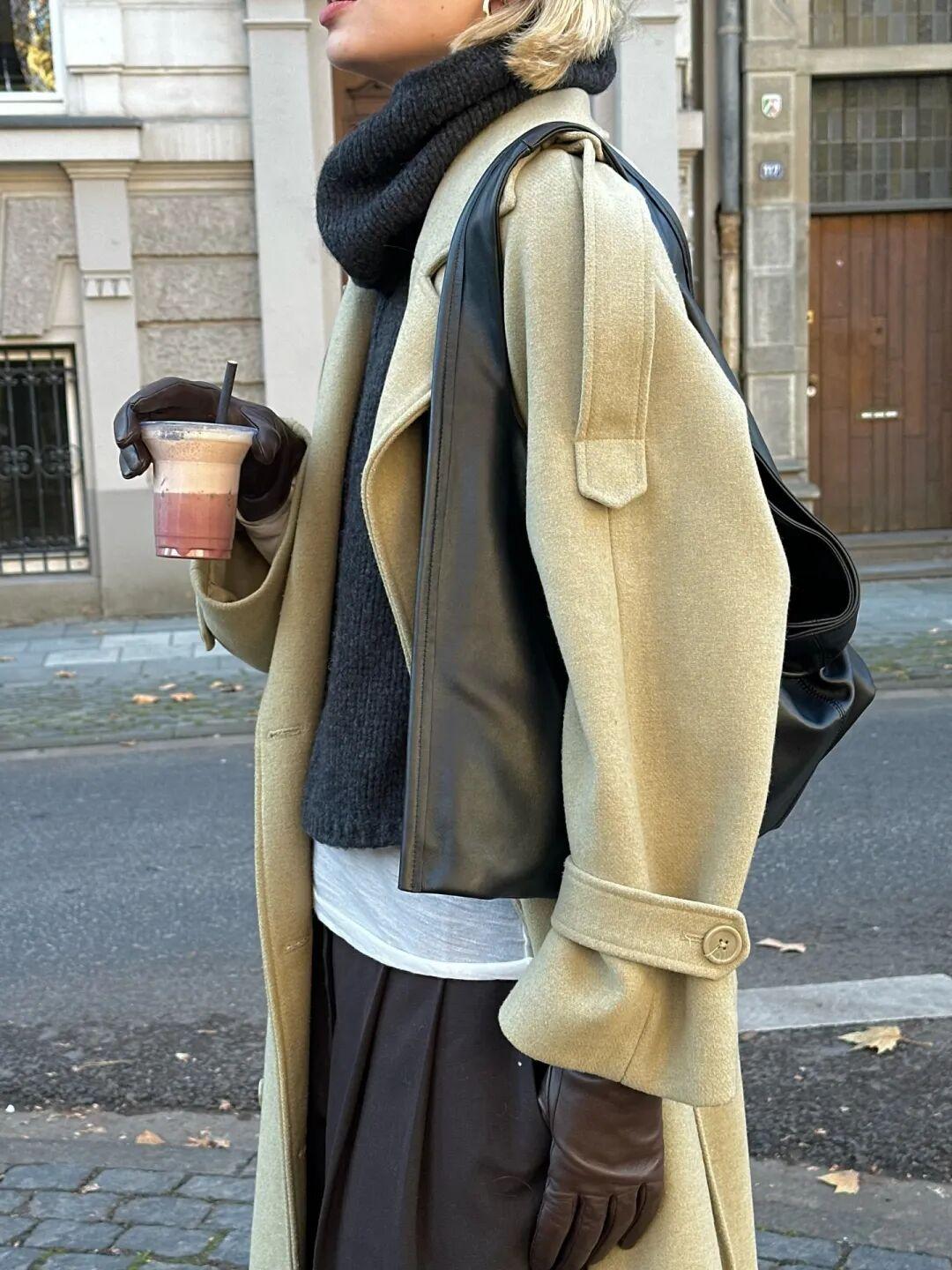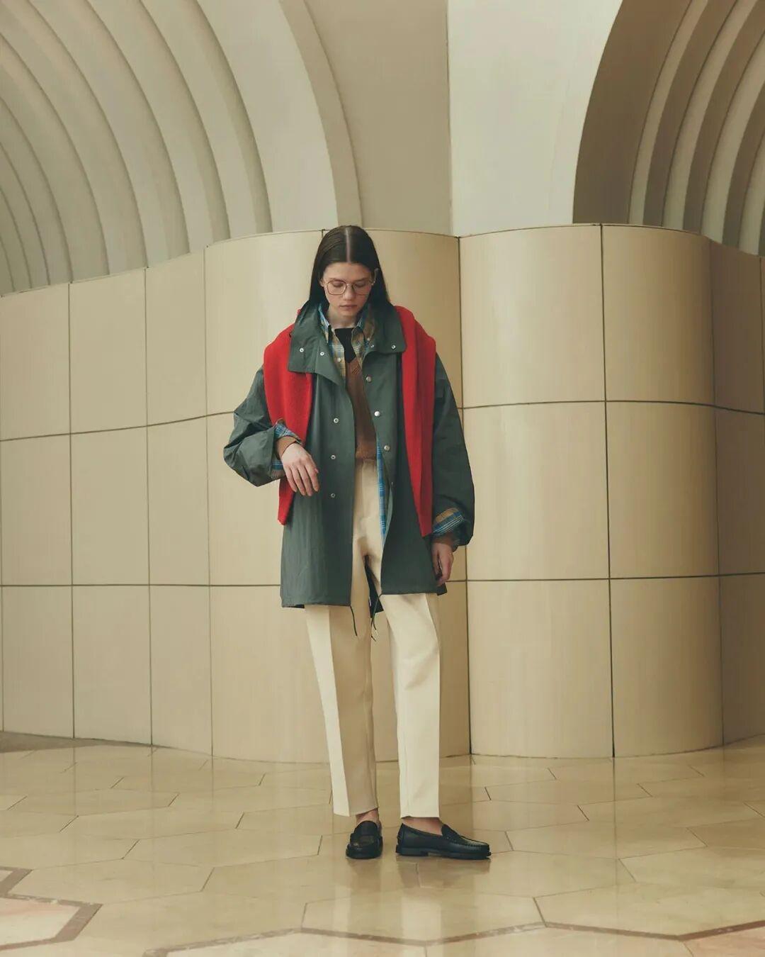 除了藍色,卡其色和紅色搭配也很出彩。不需要大面積,只要一點點紅,作爲內搭或配飾,就能有點亮全身的效果,過年穿也應景。▼