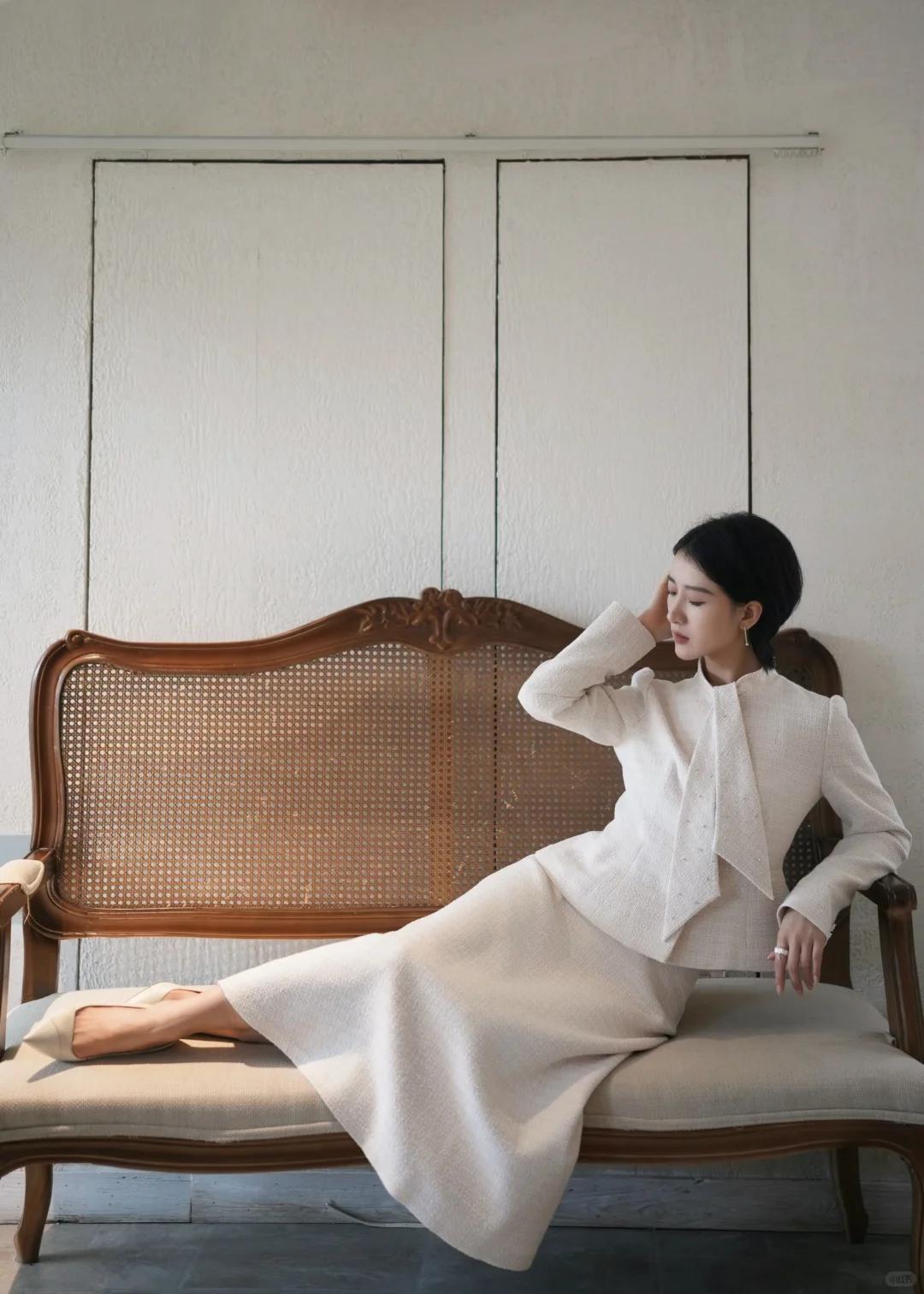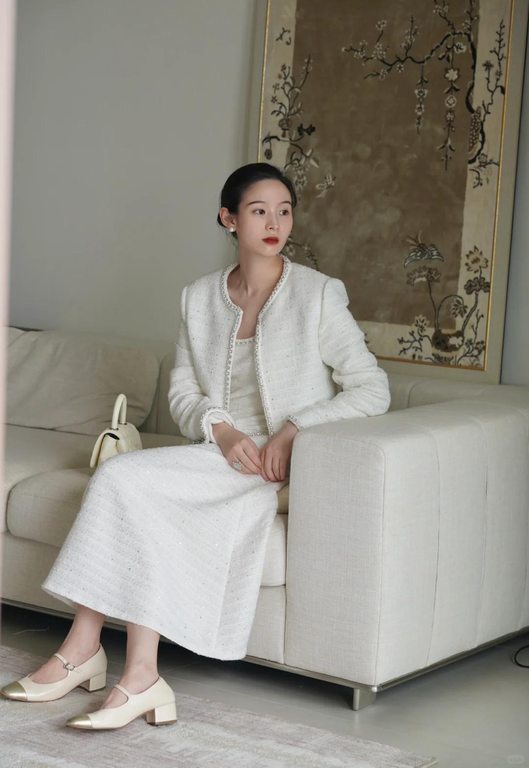 小技巧:配飾儘量“少而精”——一隻精緻手錶、一條細項鍊、一個小方包,就夠了。不要堆砌太多金色、珍珠元素,反而會顯累。