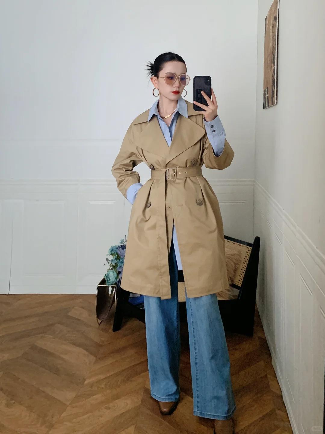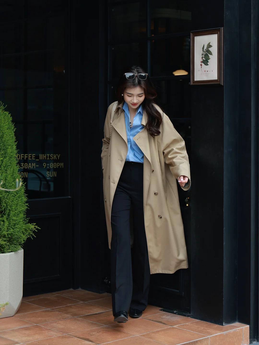小技巧:風衣繫腰帶時,系在“真腰線”以上一點的位置,視覺腿更長;若想更鬆弛,直接敞開穿,用內搭突出腰線即可。
