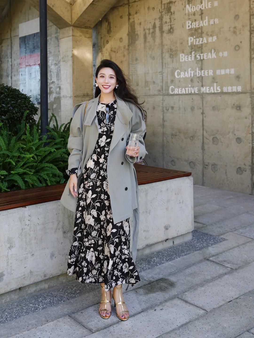 柔美約會:風衣 + 連衣裙/半身長裙 + 粗跟短靴/中跟鞋