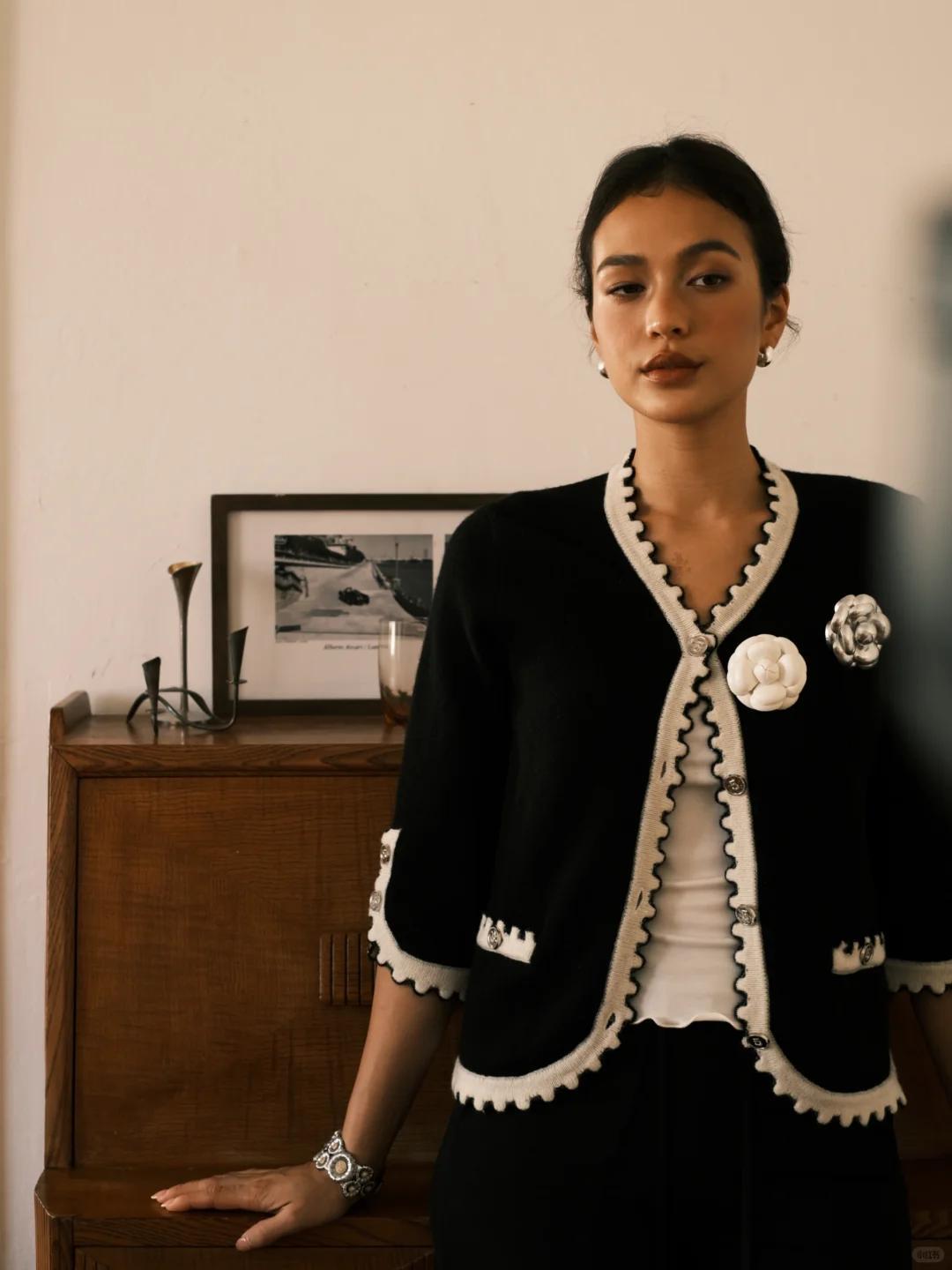 短款小香針織:帶一點金屬扣、小格紋、珍珠扣,既有小香風的精緻,又沒那麼隆重。