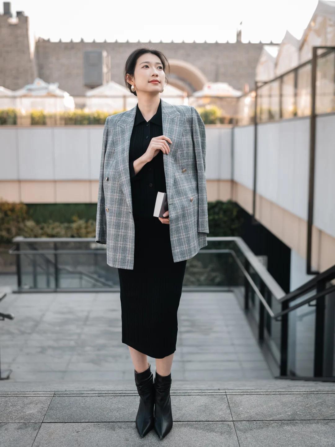 又或者西裝+針織裙+粗跟短靴。