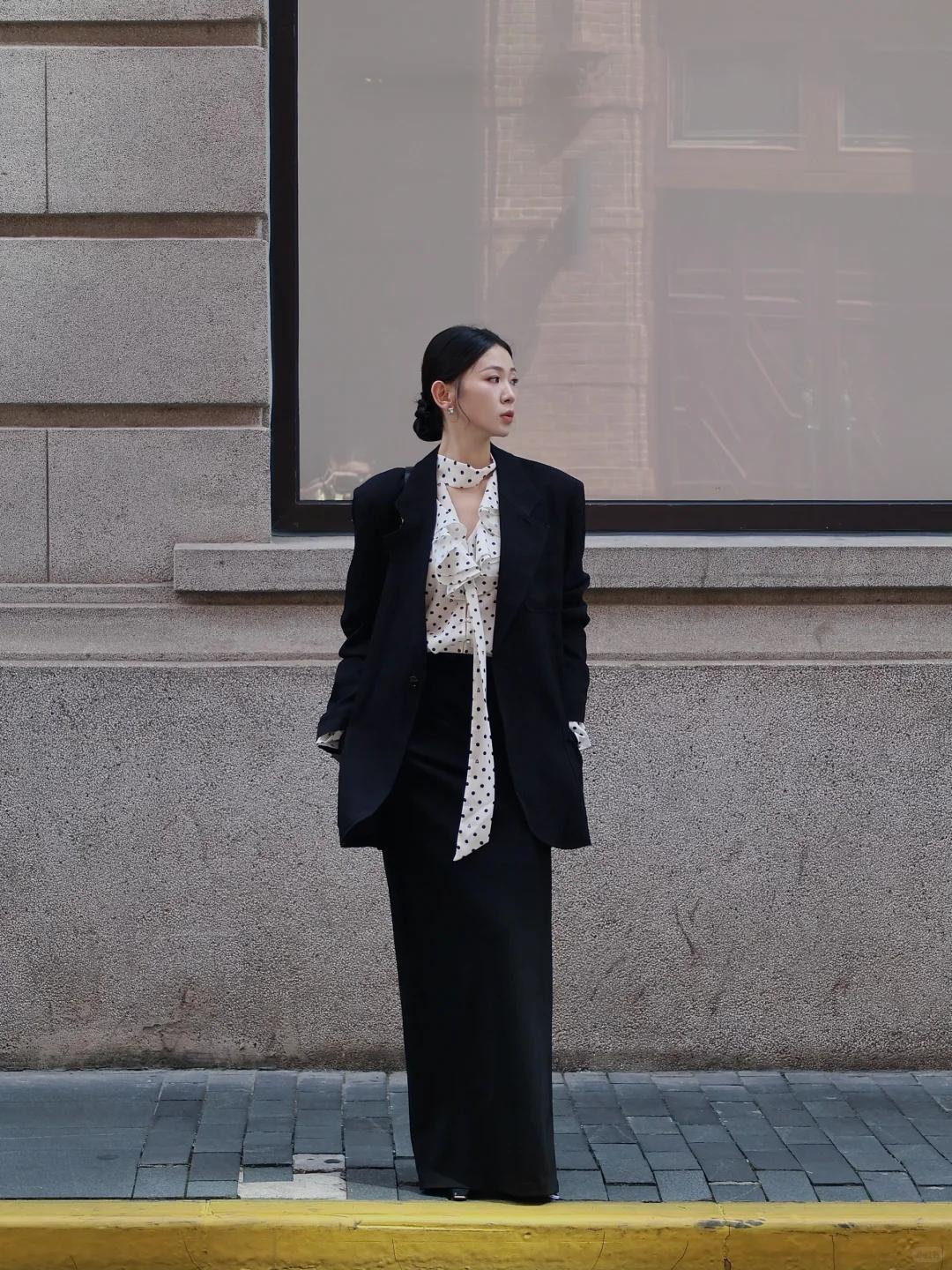 上班通勤:西裝+襯衫/真絲飄帶襯衫+高腰直筒褲/鉛筆裙+尖頭單鞋/樂福鞋