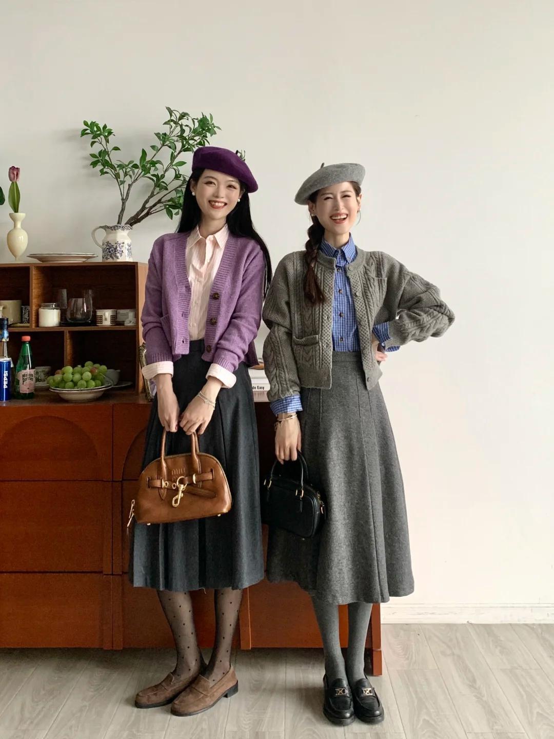 溫柔聚會風:小香風外套 + 針織打底 + 同款半身長裙/A字裙 + 粗跟短靴/中跟鞋