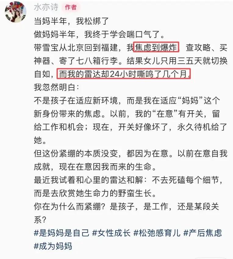 從央視的女主持,到給娃換尿布的媽媽,水亦詩心甘情願的接受着這一切的變化。