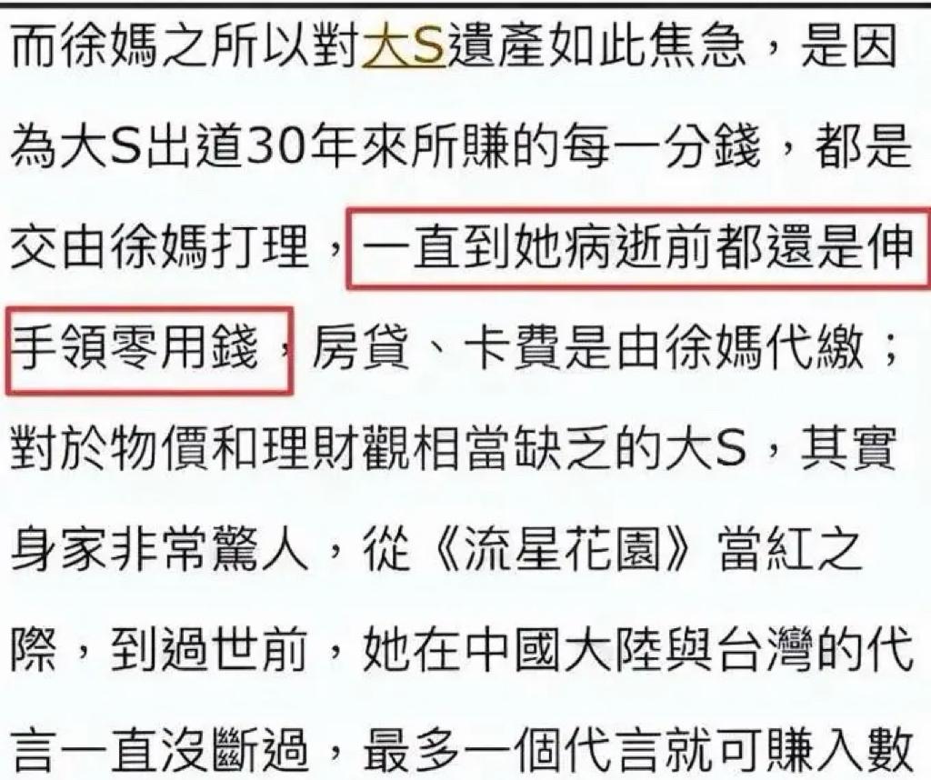 大S出道30年來所賺的每一分錢,都是交給S媽打理的,一直到她病逝前都在伸手領零用錢。大概這也是爲什麼,黃春梅會對大S遺產如此焦急的原因吧。