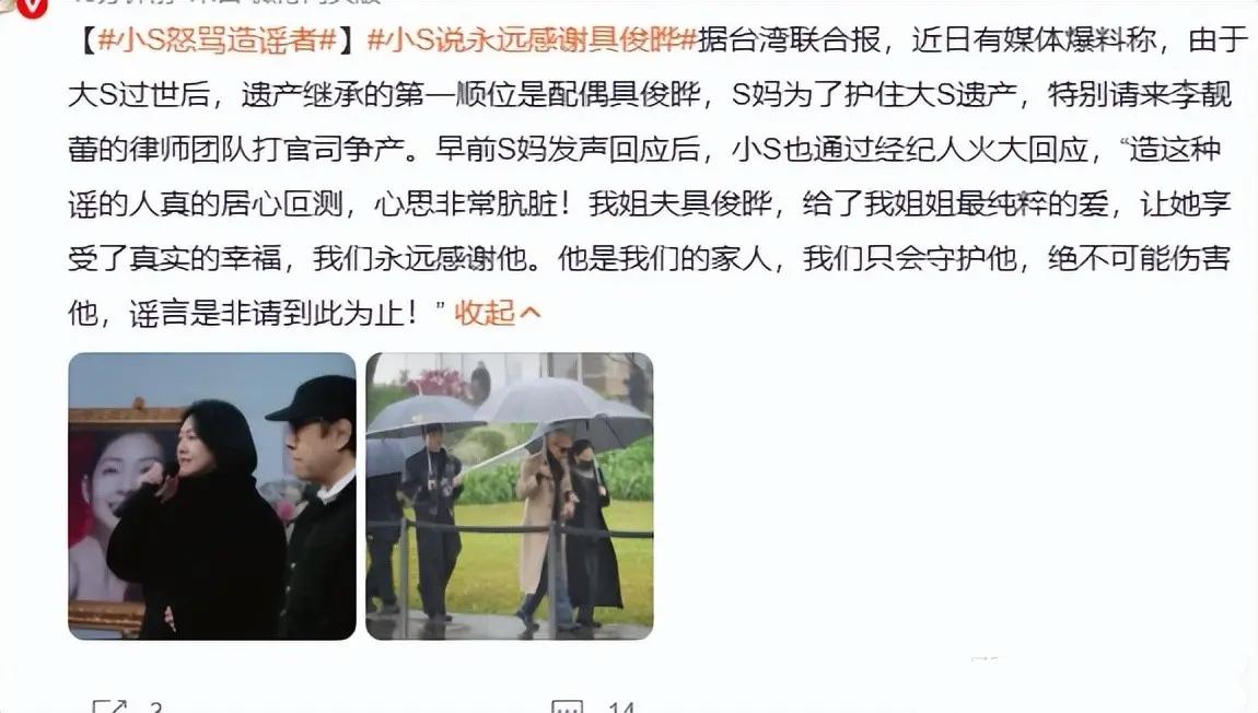 甚至有爆料稱,S媽欲和具俊曄打官司,爭奪10億新臺幣的遺產。可緊接着S媽黃春梅,還有小S都闢謠了。一個說歐巴是兒子,一個說全家都會保護姐夫。
