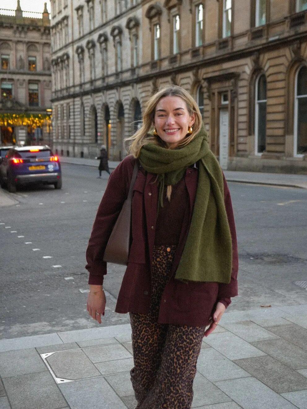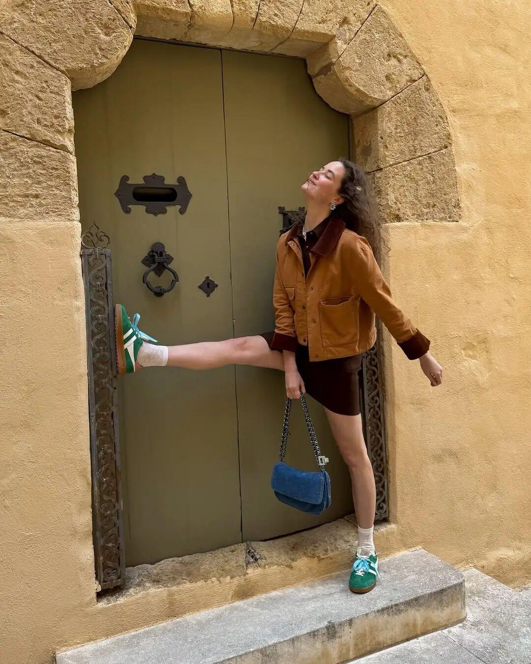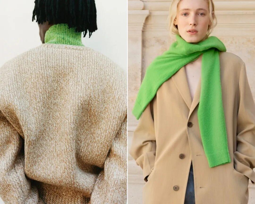 很多人家裏大概率都有一件棕色外套,只要搭配一件綠色內搭,就能輕鬆穿出春日感。