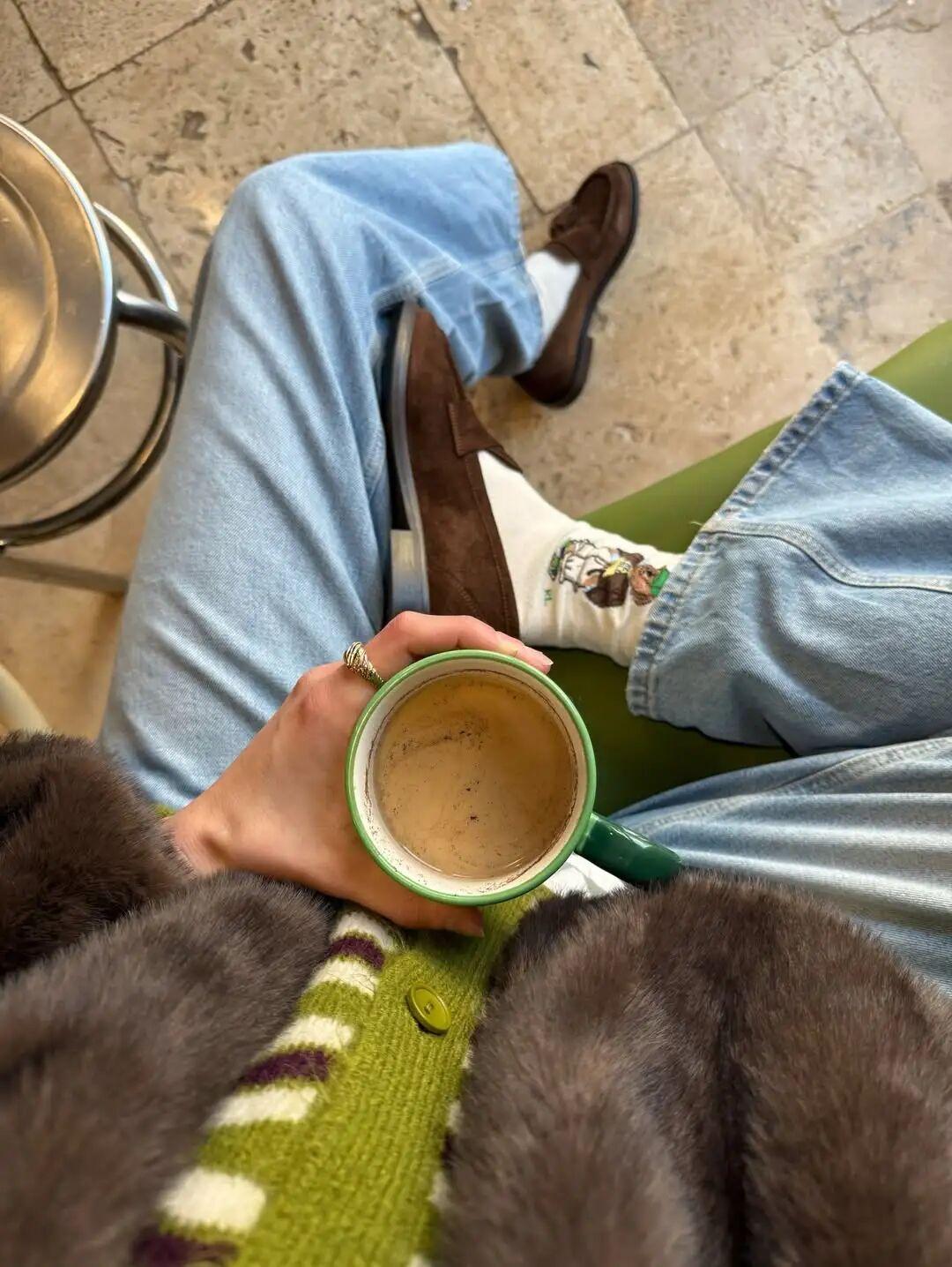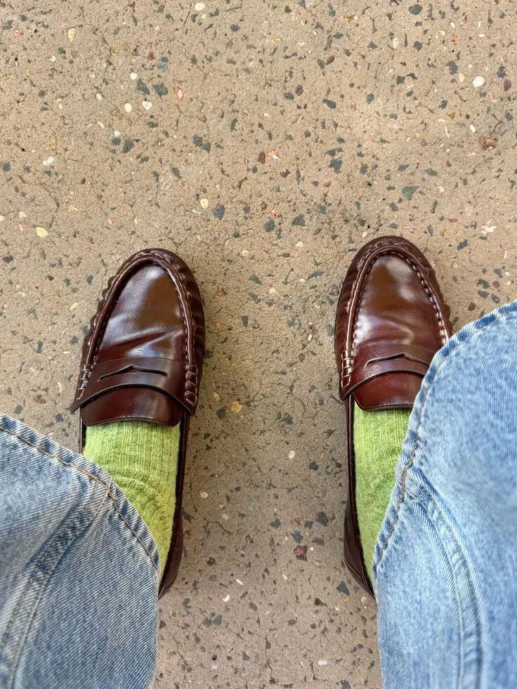 不想大面積穿綠棕配的朋友,也可以試試綠色襪子+棕色樂福鞋。▼