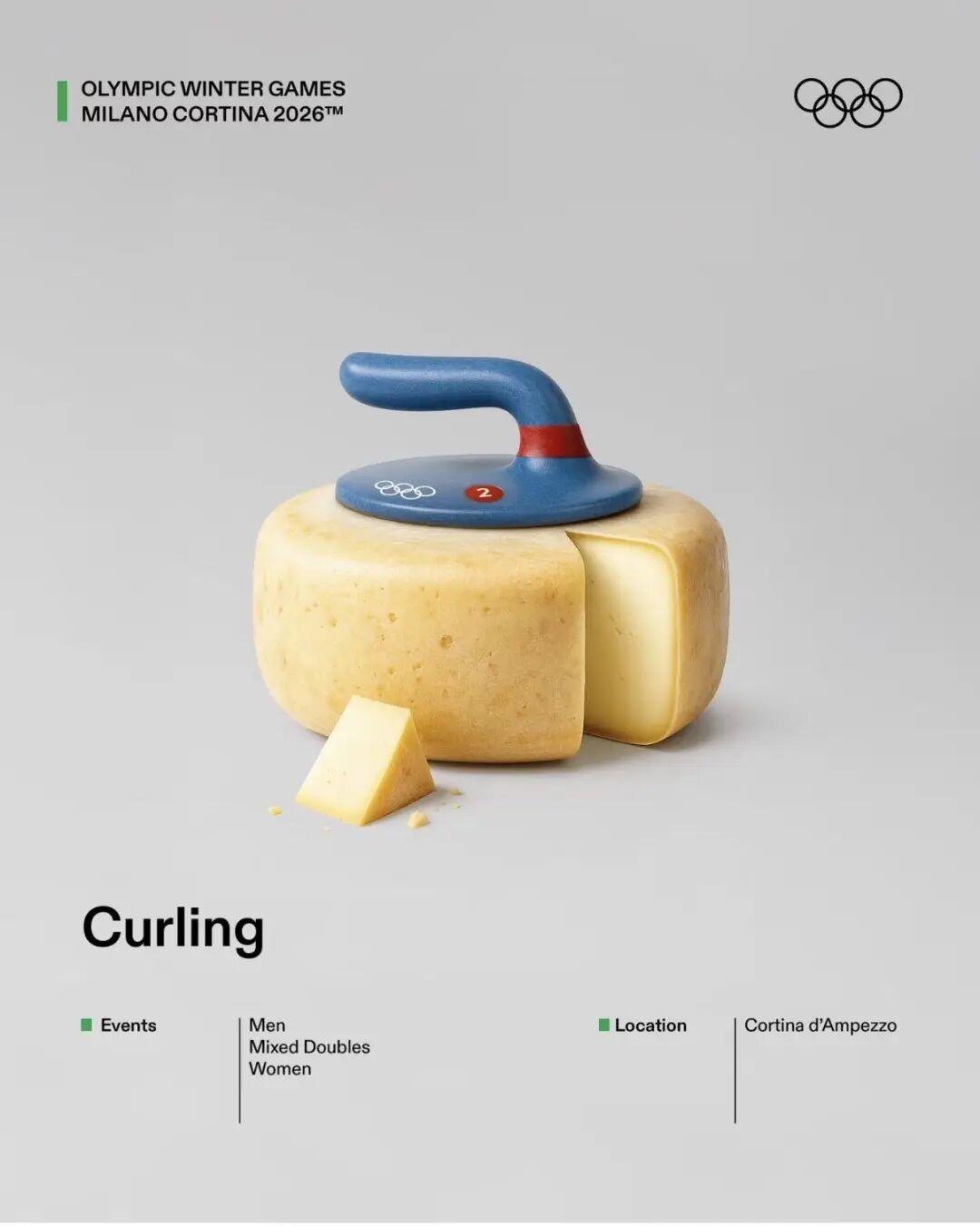 意大利冬奧會的海報設計的黃藍配——“奶酪冰壺”。▼