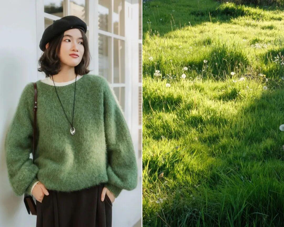 可以先嚐試給其中一種顏色“降調”,比如選帶點灰度、泥土感、復古色調的綠色,像從去年就開始火的橄欖綠、苔蘚綠、軍綠色、豆綠色都是不錯的選擇。▼