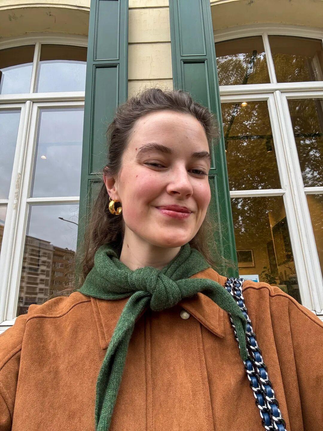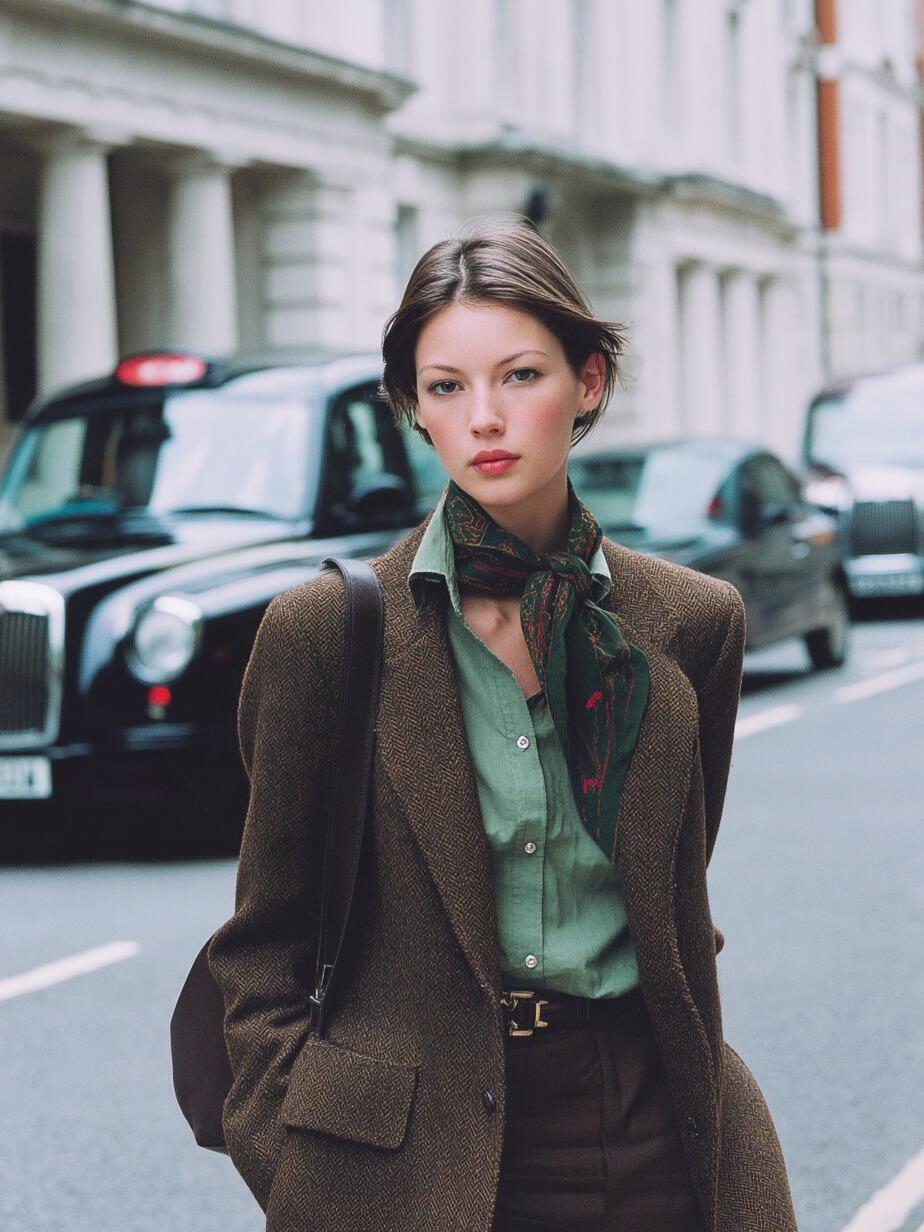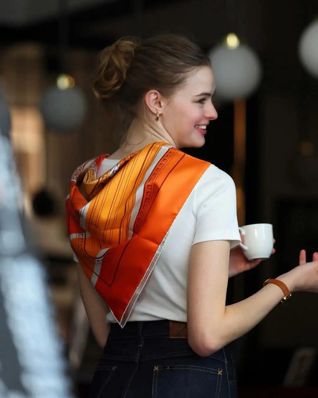 如果想要更低調/更好駕馭的組合,可以試試橙色絲巾,搭配棕色皮革小單品,比如皮手錶、皮包。