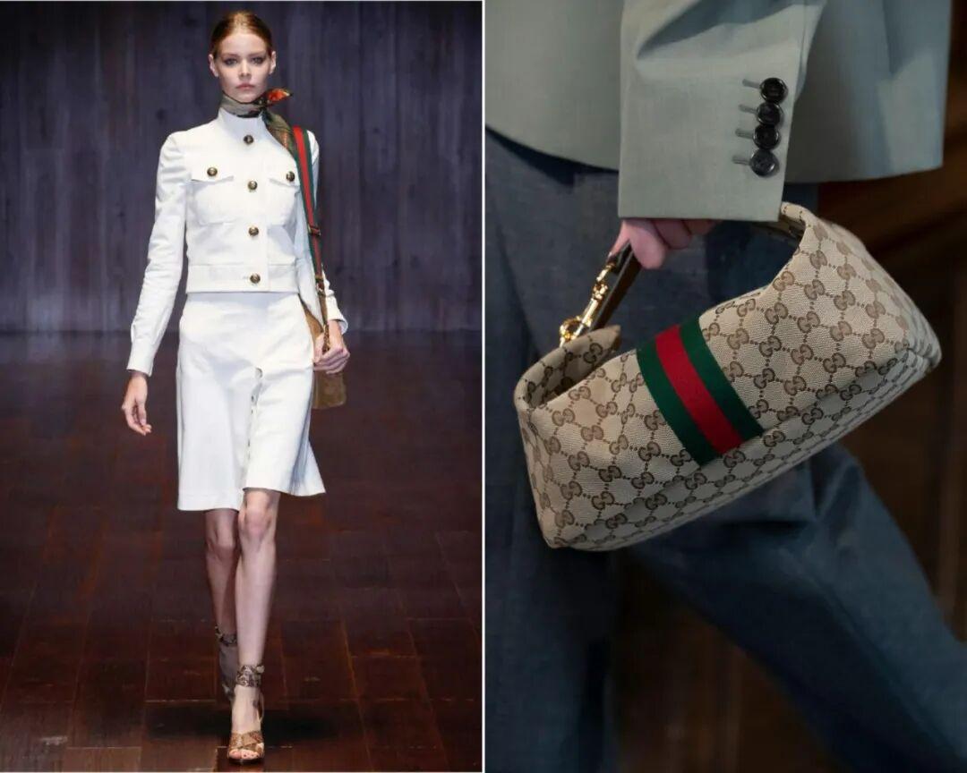 2015年(左)和2026年(右)春夏大秀的紅綠織帶元素,很容易讓人聯想起品牌的意大利基因。▼