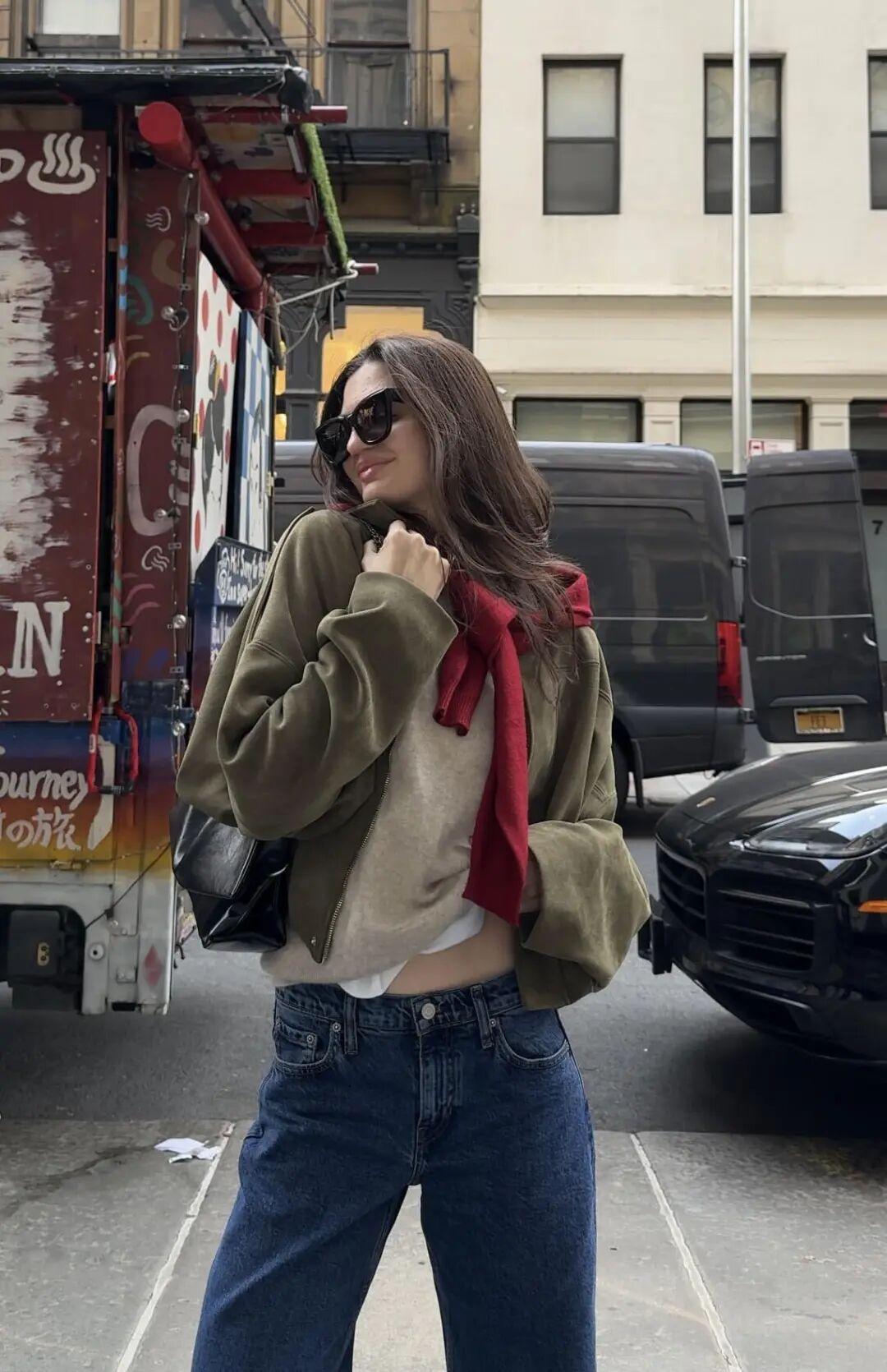 下裝推薦牛仔褲,能很好地承接上身的紅綠撞色。▼