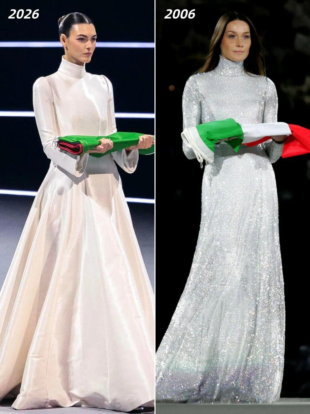 “小李子女友”超模Vittoria Ceretti手捧國旗入場(左),造型致敬了20年前同樣擔任護旗手的超模Carla Bruni(右),兩人都身着阿瑪尼高定(Armani Privé)。▼