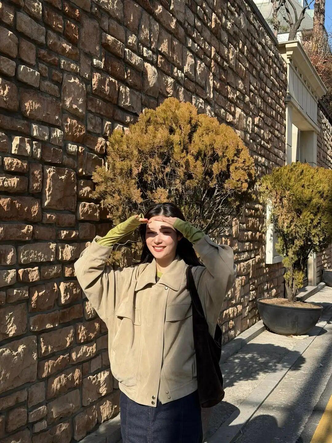像鄭採妍一樣在卡其棕外套袖口,露出一截綠色袖子。▼