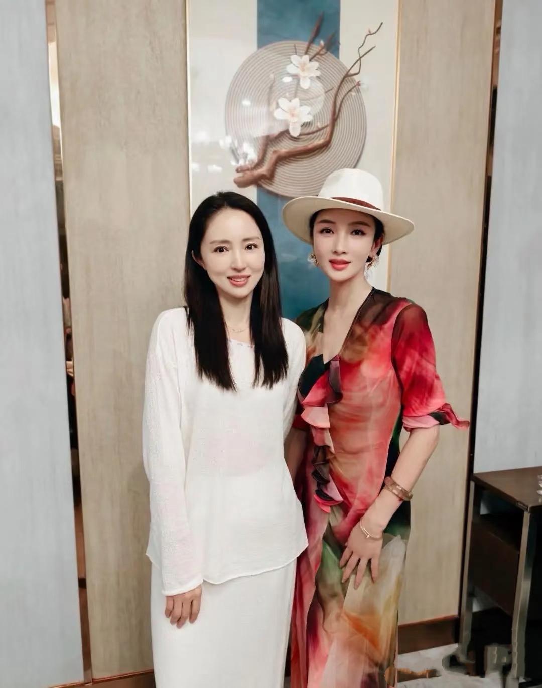 許久沒見的朋友聚會,都會認真打扮一番。董璇和好友的穿搭都很洋氣,尤其是好友還穿了一條修身的印染長裙,華麗富貴。