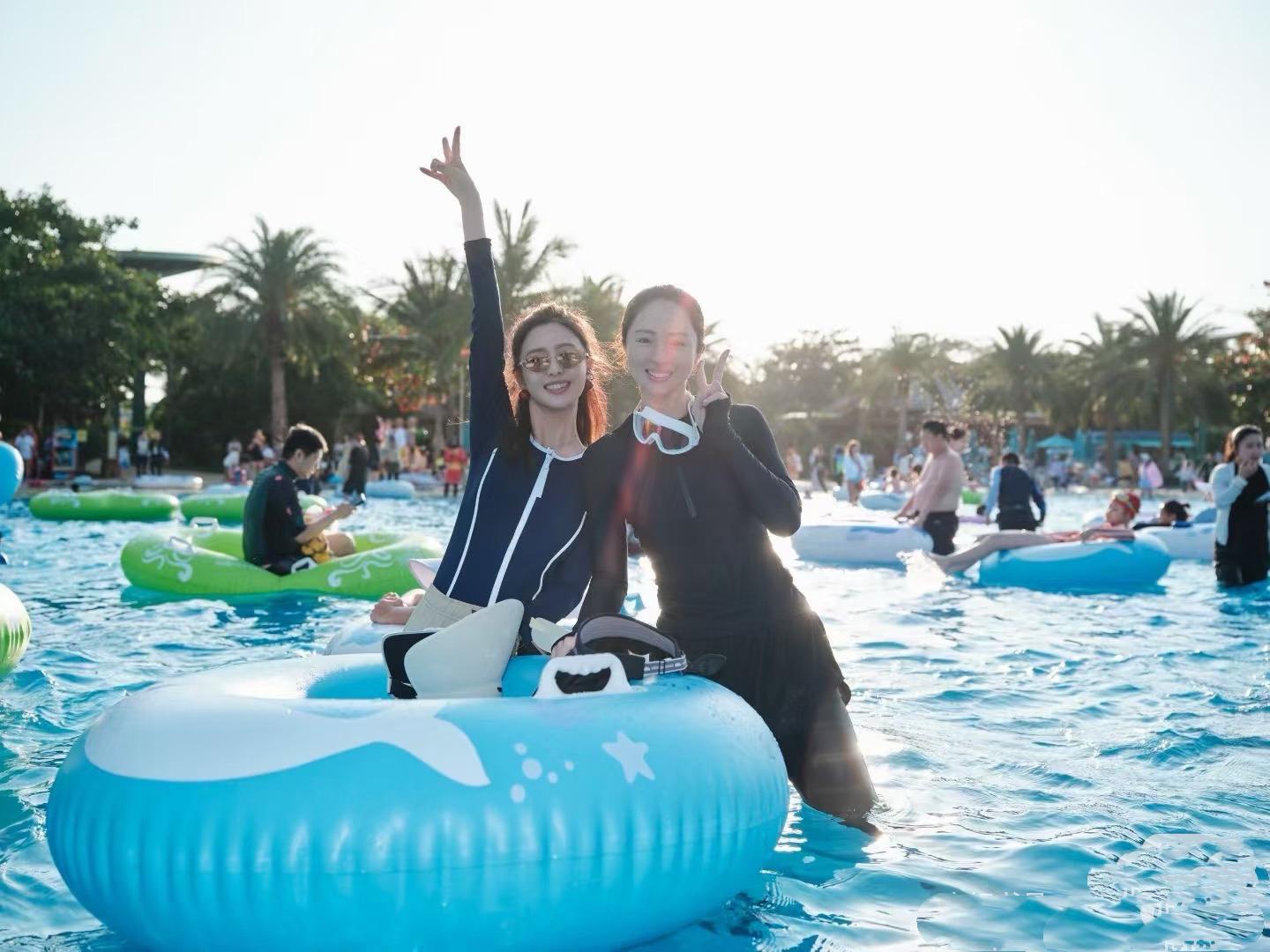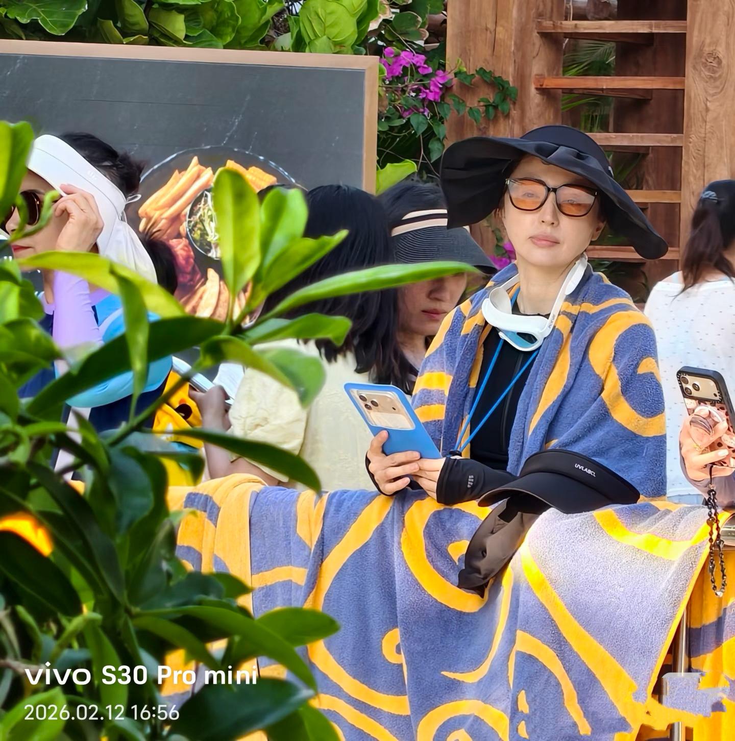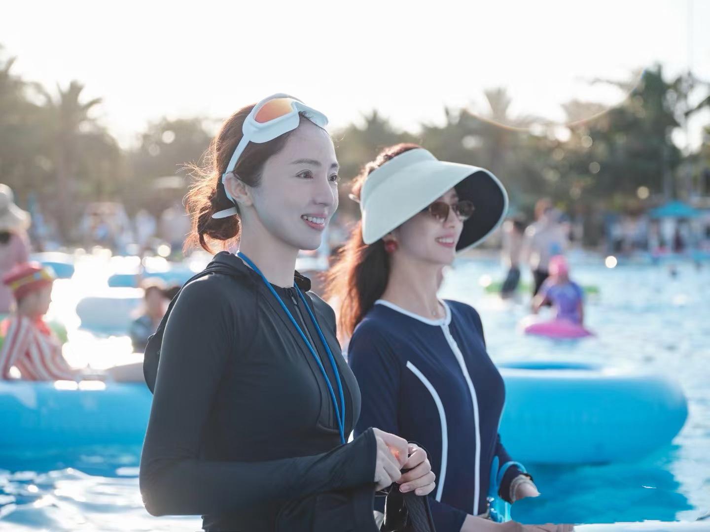 小酒窩和朵朵在泳池裏玩耍的時候,董璇就會坐在岸邊看着,她披了一件印花的毛毯、戴着遮陽帽,一邊看手機、一邊頂着孩子們玩耍,放鬆又快樂。