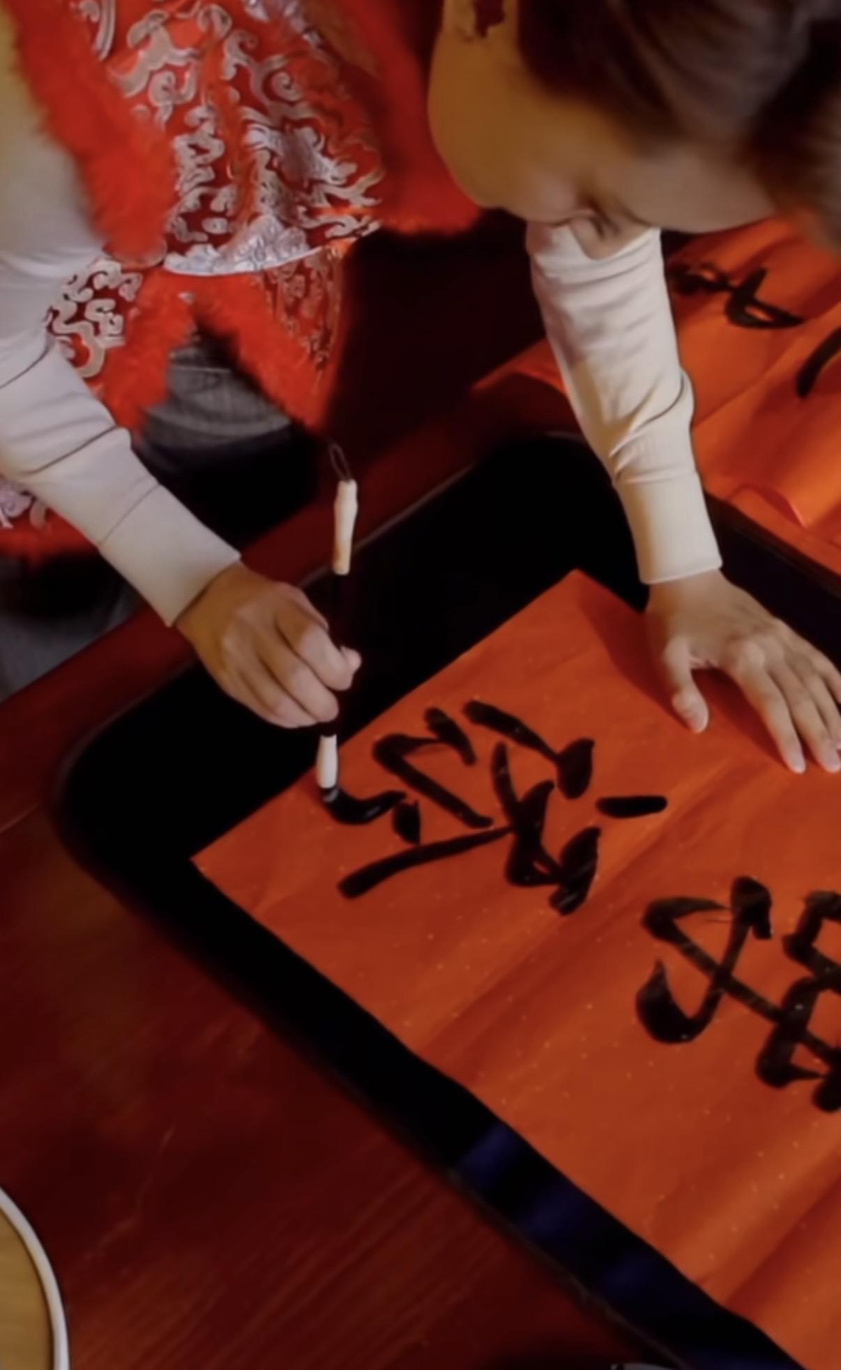 鮮豔的紅底灑金宣紙,在豬肝紅的木質桌案前,張蕾拿起毛筆、她的字跡清秀有力,墨色濃黑飽滿,一看就透着書法功底。