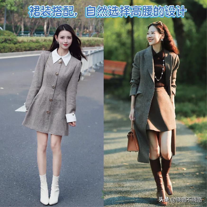 ⑵ 高腰短款的裙裝+無痕短靴,結合長款的外搭