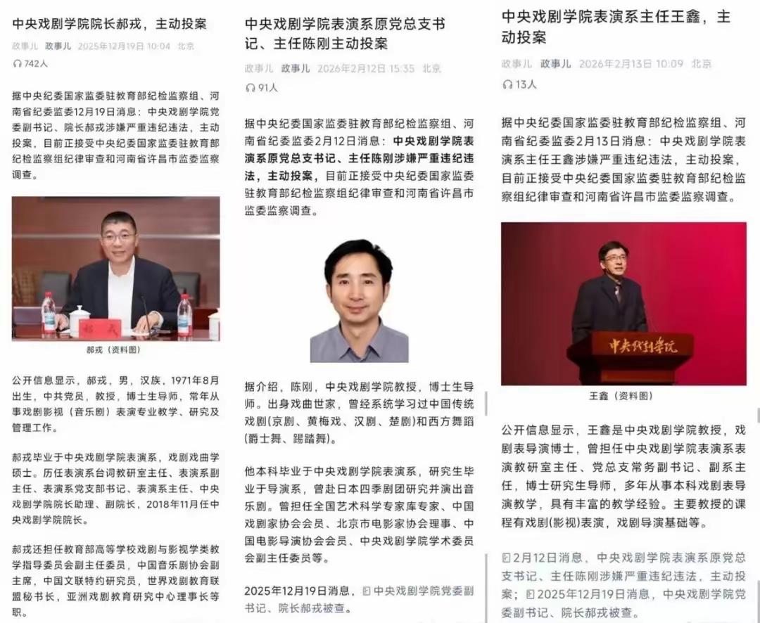 陳剛:2026年2月12日投案,曾任中央戲劇學院表演系主任,執掌表演系招生、教學、管理大權。巧的是閆學晶兒子林傲霏作爲2012級表演系本科,陳剛則剛好是林傲霏在中戲就讀時期的原主任。