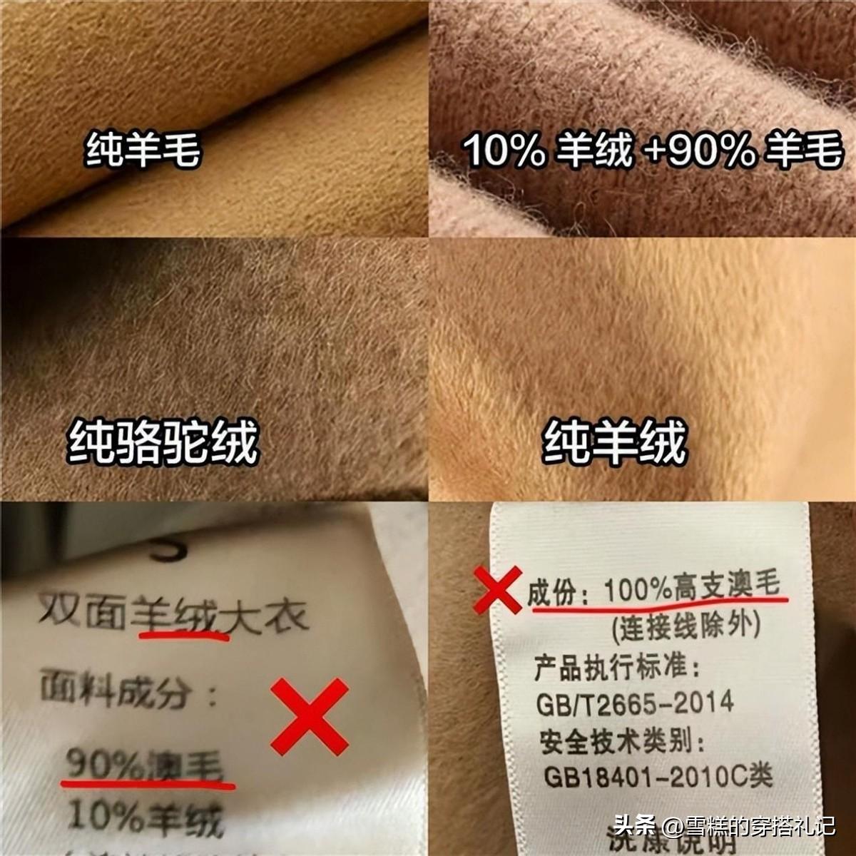 #首先學會看面料標# 羊毛含量要是≥85%,羊絨類的話含量≥30%的幾種款式穿着舒適度最高。要是在水洗標上寫則“聚酯纖維、粘膠”等字眼的就儘量不選