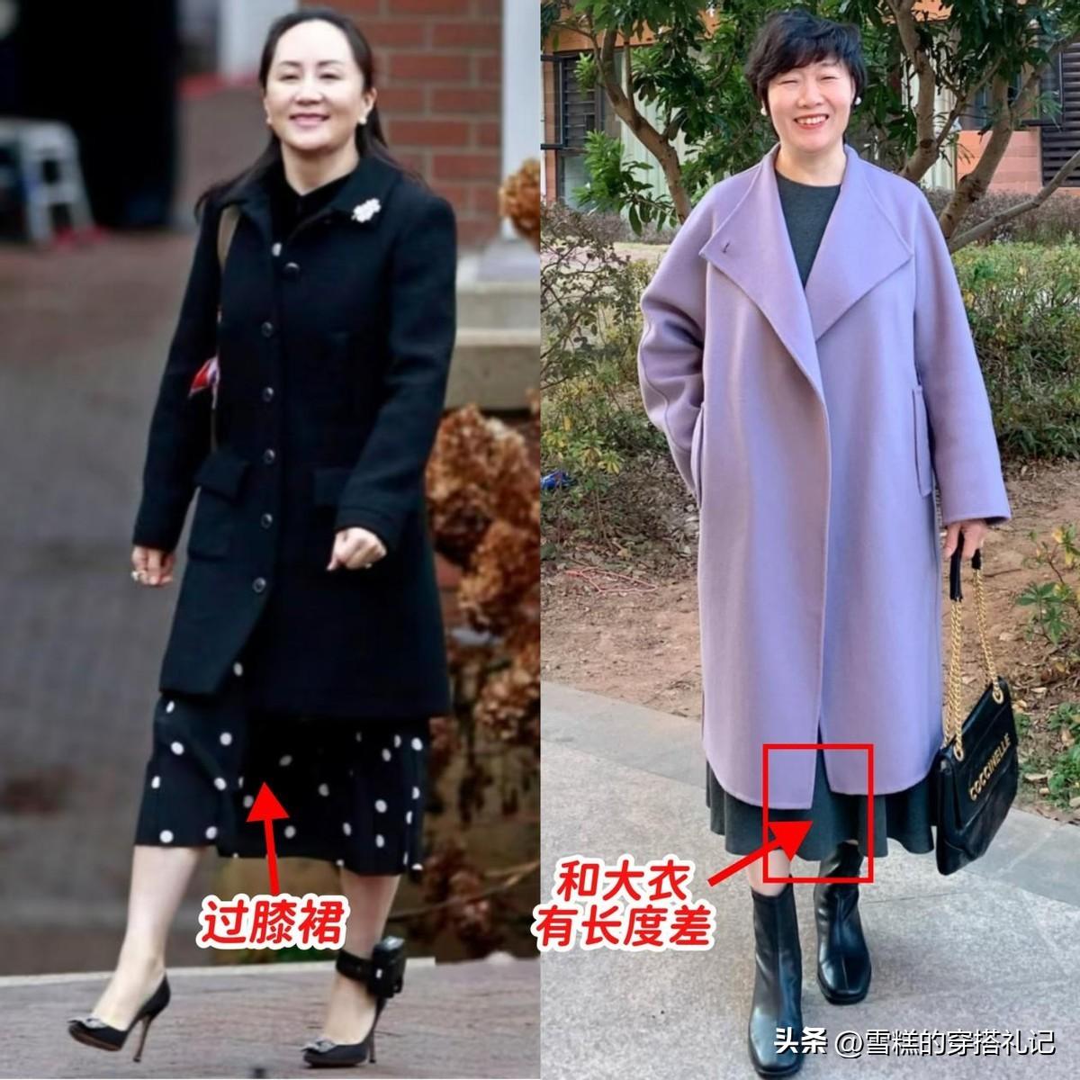 ①關於長度:像孟晚舟這樣在搭配大衣的時候,選擇一些長度卡在小腿肚下方3cm左右的過膝裙最好看。它既可以遮住因年紀增加而逐漸鬆弛的小腿線條,又可以留出一截腳踝肌膚,給造型製造出了恰當的“留白”空間,幫助製造瘦削高挑的造型。