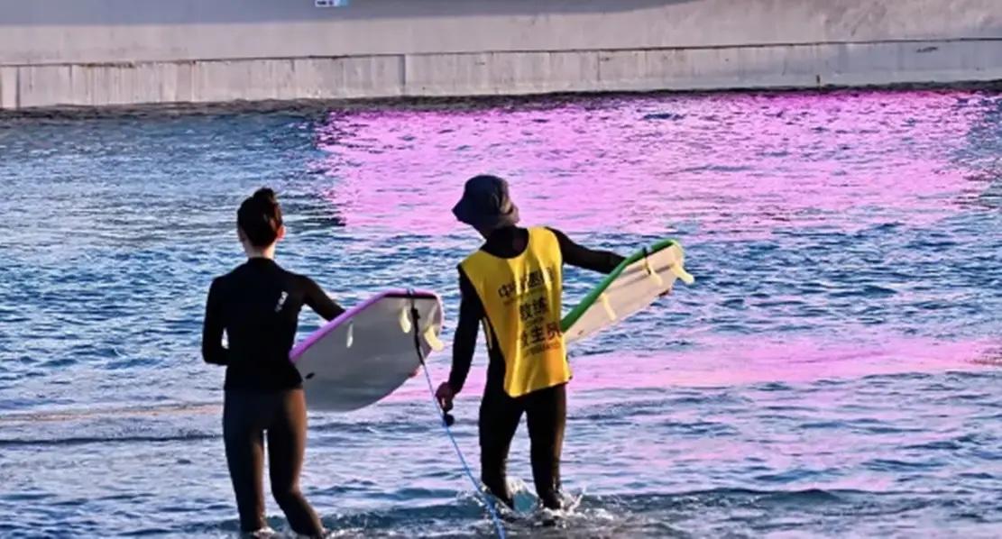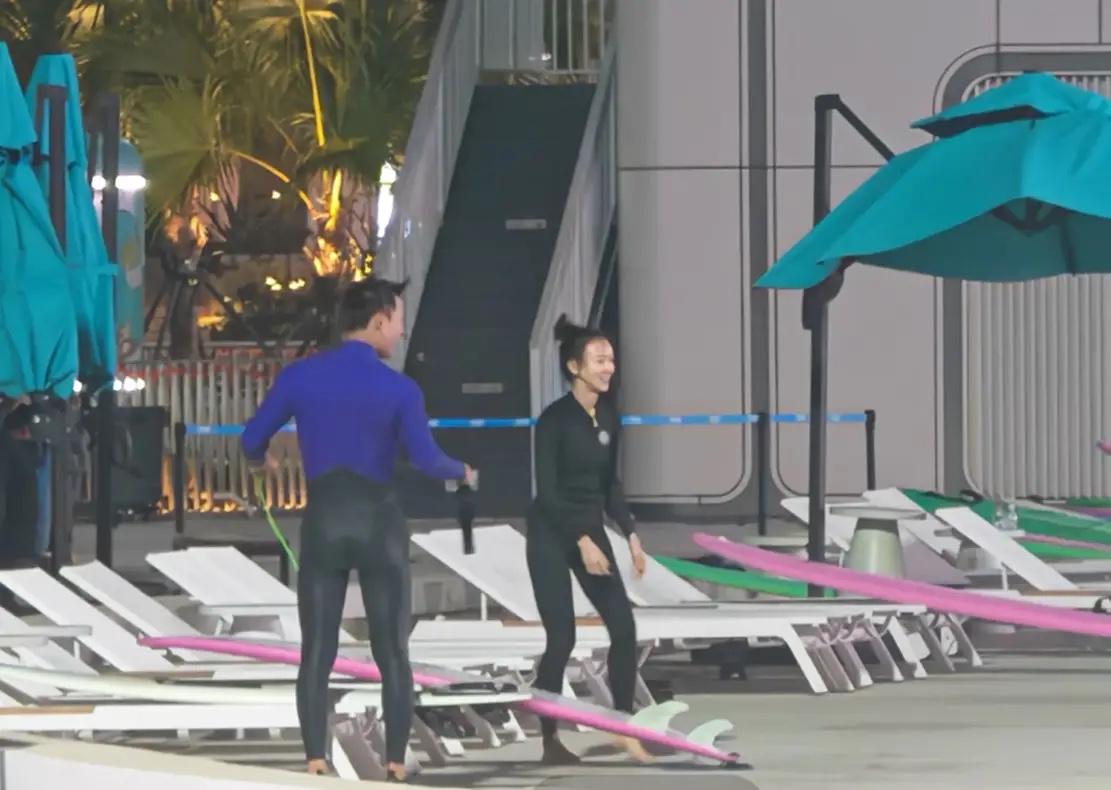這次三亞過年,吳謹言夫婦沒有帶孩子,可以更盡情地玩耍。他們選擇比較刺激的衝浪體驗,吳謹言像是個新手小白,有教練在一旁耐心地教她。