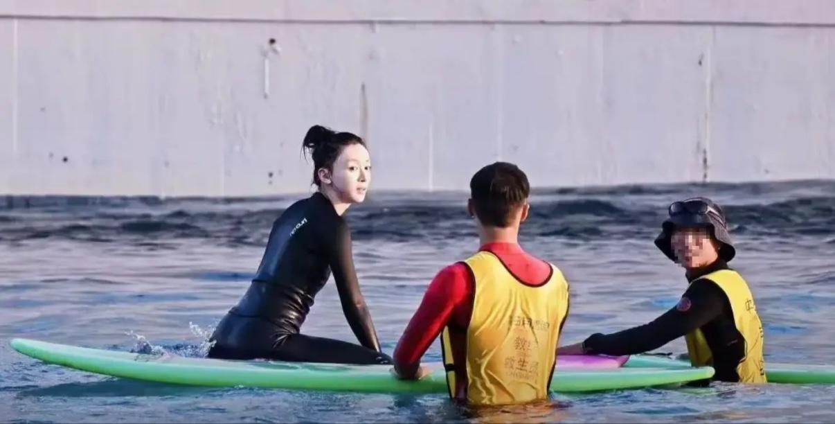 吳謹言穿了一身黑色系的衝浪服,把頭髮高高的紮成一個丸子,素顏的狀態皮膚很白皙,又美又嫩的。